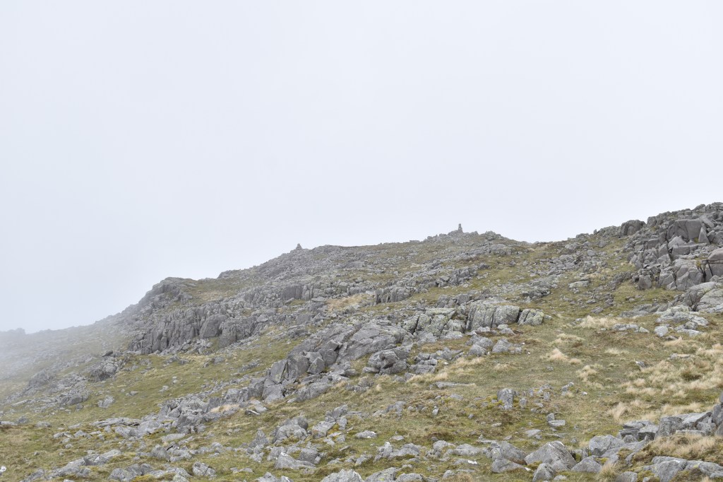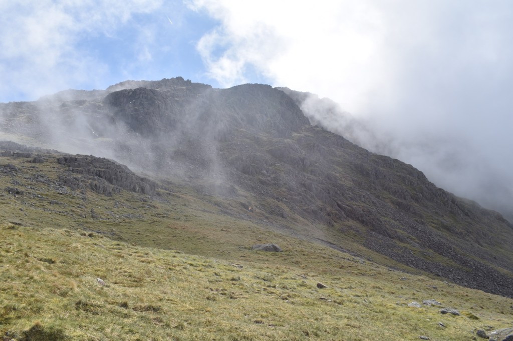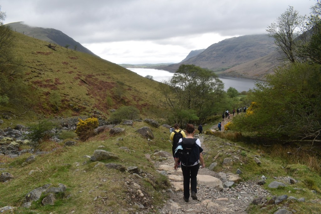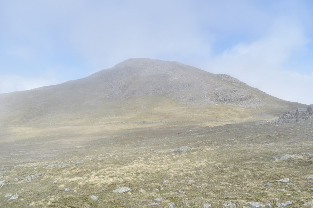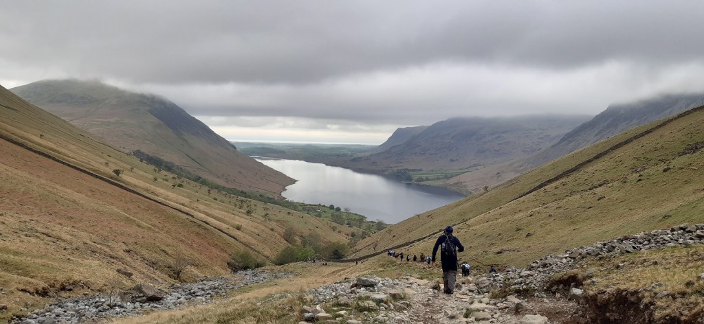Day 3 in the Lakes and 3 walks already, after yesterday with a long walk of 12 miles but not too much steep walking, today was different. A short walk of only 6 miles but a never ending staircase trudge both up and down. The only break from the constant line of people heading up to Scafell Pike, was the detour off to collect Lingmell which was my 197th Wainwright. This one was missed on my first ascent of Scafell Pike via the Corridor Route, back when I wasn’t really bagging Mr Wainwright’s list, which does seem rather foolish when you look at things. Linda also had never been up Scafell Pike, and as we were staying at Irton Hall, at the other end of Wasdale, it seemed like a good opportunity to correct these things. With all the other fells that I had to conquer in Wasdale, this walk was set for the bank holiday Sunday, which may have been the one busy day here, as people watched the Coronation the day before. The weather was checked and the report was for cloud to lift in the afternoon and as we weren’t far away we planned to arrive at Brackenclose around 9ish and easily get a parking spot. One of those things came true as we found an easy space in the car park and booted up. One thing about climbing Scafell Pike by this direct route is its popularity. It is one long stream of walkers, all travelling at different speeds and with varying different levels of clothing and kit. One girl had only a pack of Wurthers Original to power her to the top, another lad had a litre of water (which he’d consumed most of by the crossing of Lingmell Gill on the way up to Hollow Stones). One lady heading up in flat slip on smart shoes and an overcoat and one guy who had a sound system with him, no doubt assuming that we all needed to hear his incredibly bad taste in music. Its not a path I, nor Linda, would choose again. I hated being followed, almost pushed up and down the mountain by walkers wanting to get past me. I mentioned at the top that we’d succeeded with the parking, however the second part was that the cloud did not lift, or it did briefly before dropping again. We hardly got any views from the higher parts of the walk, and it only cleared as we hit the 400 metre contour on the way down, this probably left a bitter taste when looking back at the walk, however it did hide the long gaggle of people looking to summit the tallest mountain in England, which was a blessing. Scafell Pike is the highest and all who succeed should be congratulated, but I will come in a different way if I come here again.
