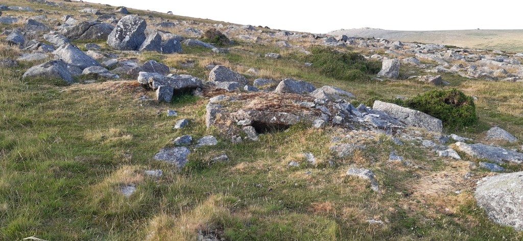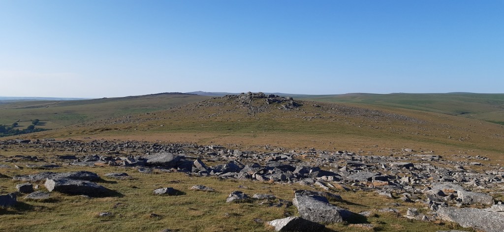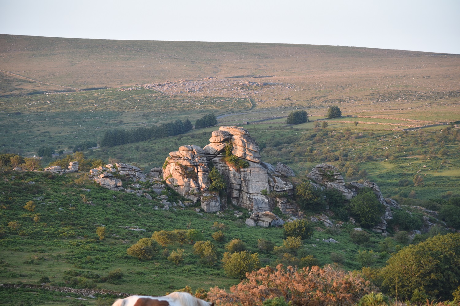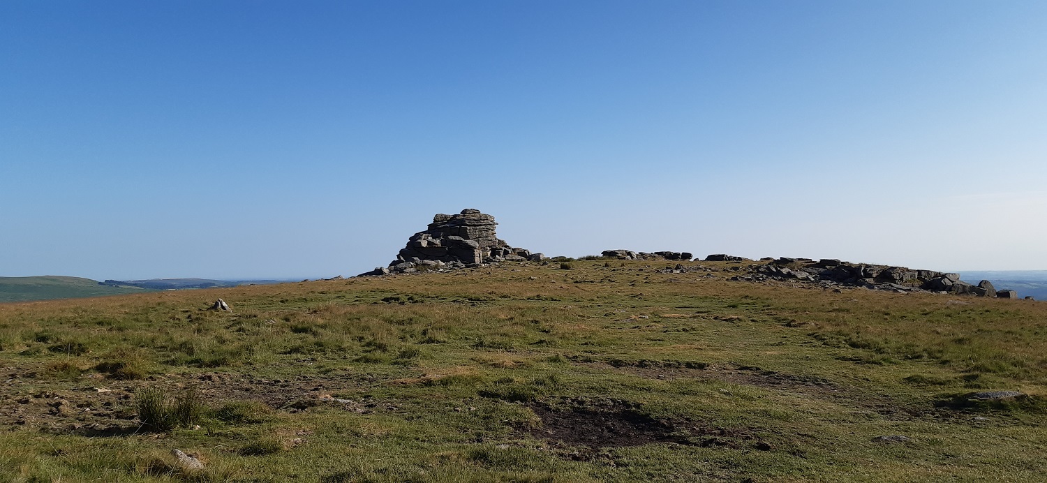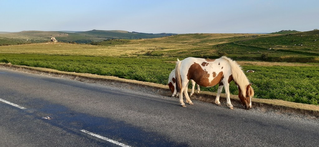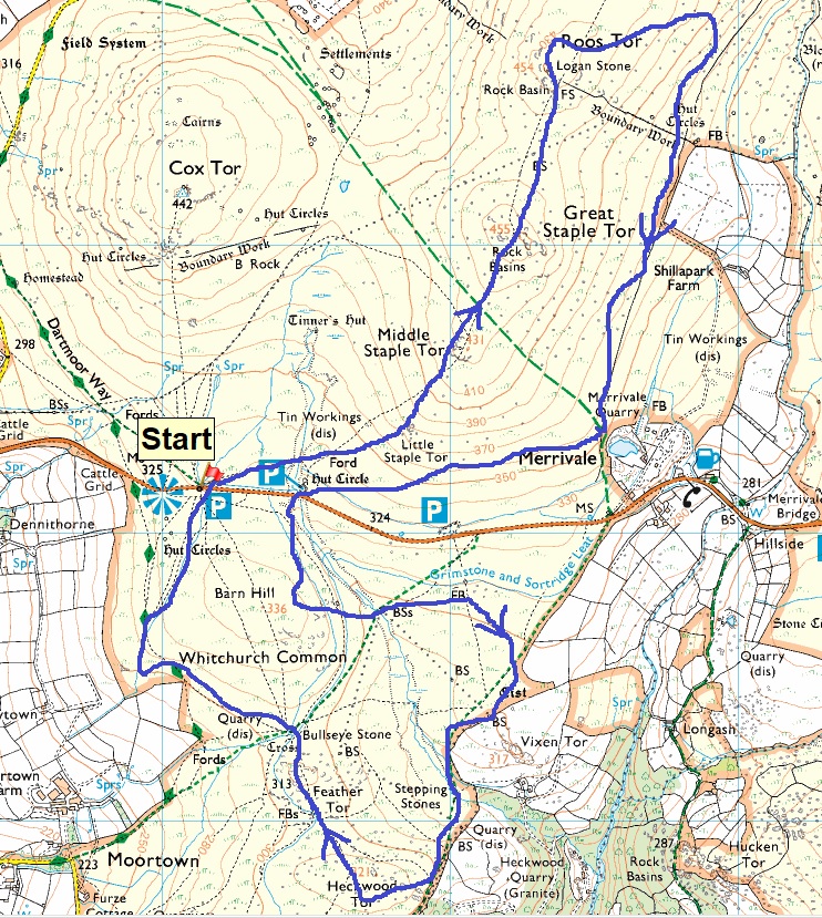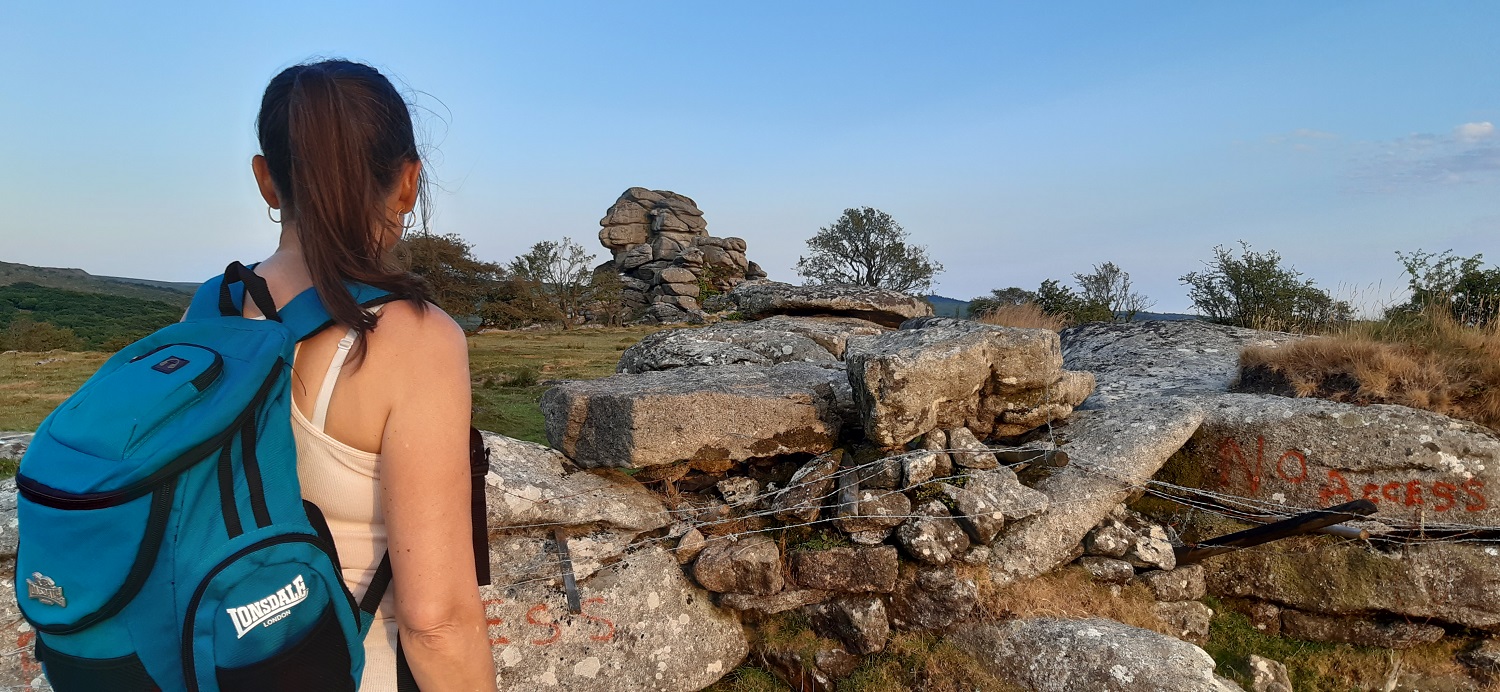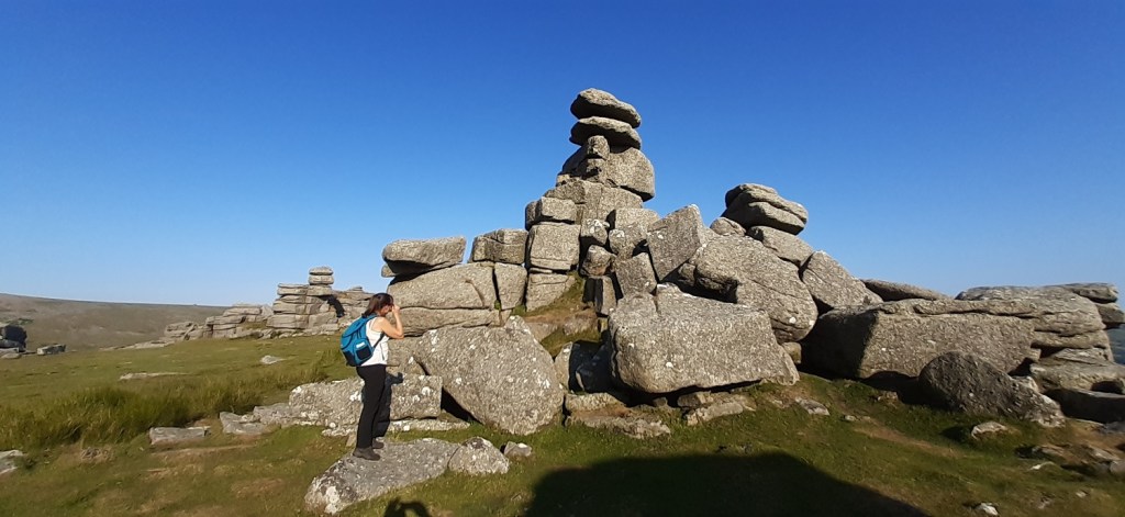 The B3357 is on the far right of the photo, this road cuts this walk in half (alongside cutting the moor in half as it heads over towards Moretonhamstead). Ahead of us are the Staple Tors, Great Staple is back left, Middle Staple is, well, in the middle obviously and Little Staple is looking like it is sliding down to the right into the bracken and gorse.On Little Staple now and the views expand as you get higher, looking to Cornwall hereAnd turning further left you get views to Peek Hill and Sharpitor with the Walkham valley running across the photo left to rightMiddle Staple Tor, one large outcrop here to the right with smaller piles on the left, Great Staple Tor is back left and Great Mis Tor back middleLooking back at Middle Staple Tor shows the larger outcrop clearly with the flatter piles to the rightLinda heading for Great Staple TorTall shapely stacks of Great Staple TorRoos Tor will be our next objective, there’s very little distance between these tors, a couple of hundred metres, so its an easy walk ticking off the tors at a pace.I prefer Roos Tor to Great Staple, I like the stacks and the views, along the valley towards Brent Tor, is always very good, especially in the mornings when any sun would be behind you or off the leftLooking back to Great Staple TorFrom the back of Roos Tor we sit on a shelf and look out into the higher tors on the west side of Dartmoor. A bit of zoom picks out Great Links Tor at the back and I think that’s Hare Tor in front of it. White Tor is on the left edge of the photoThe back of Roos Tor, we stopped here for a drink to enjoy the viewLooking to the mast at Princetown from Roos Tor and the secret shelf at the back.Bit of zoom again towards Fur Tor with Cut Hill over to the right of thatLittle Roos Tor is just down the hill from its big brother, and gives views out along the Walkham valley. We will walk that way nextThe path from Little Roos Tor takes us to Merrivale Quarry. Princetown mast is at the back and over on the right is Kings TorAs with the boys we passed some of the Sett Makers Bankers, better ones are just below Little Staple Tor, but we headed to the road before we got to thoseThese Dartmoor ponies were eating the gravel at the side of the road. Salt crystals maybe from the winter? Vixen Tor stands out in the sun on the left, we will head right first to pass the Wheelwright Stone and Barn Hill Rocks before heading across that wayBarn Hill RocksThe Wheelwright Stone is to my right here near to the little clapper across the Grimstone and Sortridge leat, we started out for Vixen Tor and hit a very boggy section so retreated left here and looped aroundAs the sun starts to go down the sky starts to put on its show, unfortunately there is a bit of cloud gathering to the west Vixen Tor and as near as we can get to it. Even if you understand the removal of access to this tor and the barbed wire fencing, there is no place on Dartmoor for the owner to scrawl on rocks to tell usLooking to Great Mis Tor from Vixen TorAs we walk towards Heckwood Tor we look back to Vixen Tor with Great Mis behind it and the Staple Tors over on the leftAfter a brief climb we are at Heckwood Tor, keeping an eye on the setting sun we reckon we have abouot 30-40 mins to get over to the Pork Hill area for the finale