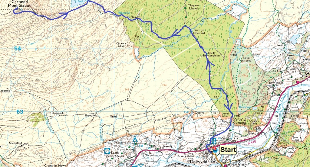 Route – Foel Gynnud – Afon Ystumiau – Llyn y Foel – Daear Dhu – Carnedd Moel Siabod – Daear Dhu – Llyn y Foel – Afon Ystumiau – Dolwyddelan