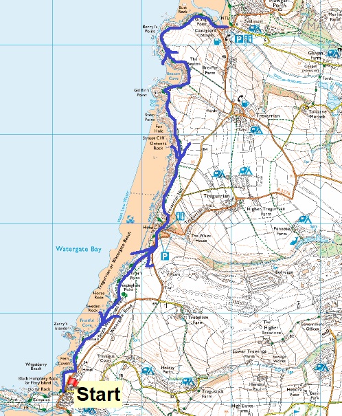 Route –South West Coastal Path – Trevelgue Head – Watergate Bay – Trevarrian Hill – Griffin’s Point – Beacon Cove – Berryl’s Point – Mawgan Porth – and the same places in reverse back to Whipsiderry