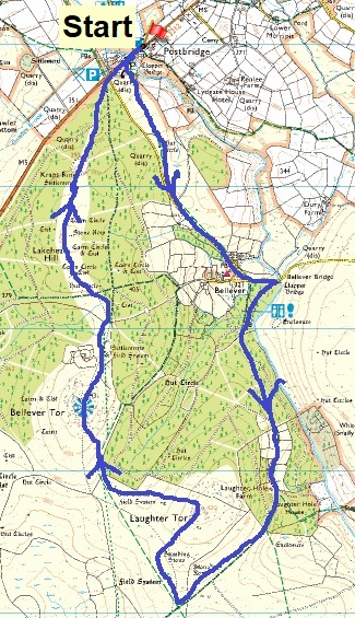 Route – Postbridge Clapper Bridge – Laughter Hole FarmBellever Clapper BridgeLaughter Tor Stone RowLaughter TorBellever TorLakehead Hill – Postbridge