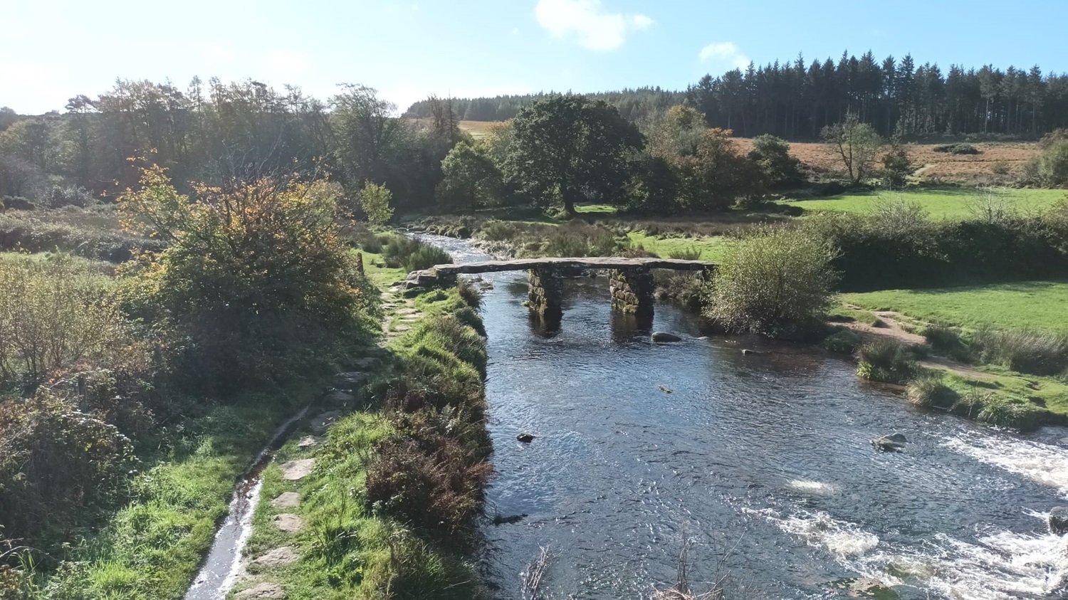 No walk from Postbridge should be without a look at the clapper bridge, the East Dart river flowing under it. We would walk to the right of the bridge and up through those trees and out to the forest beyond