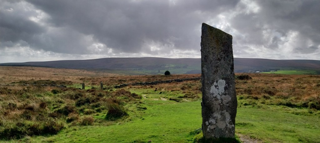 The standing stone and Ryders Hill in the distance, the clouds darkened a bit here but no rain fell
