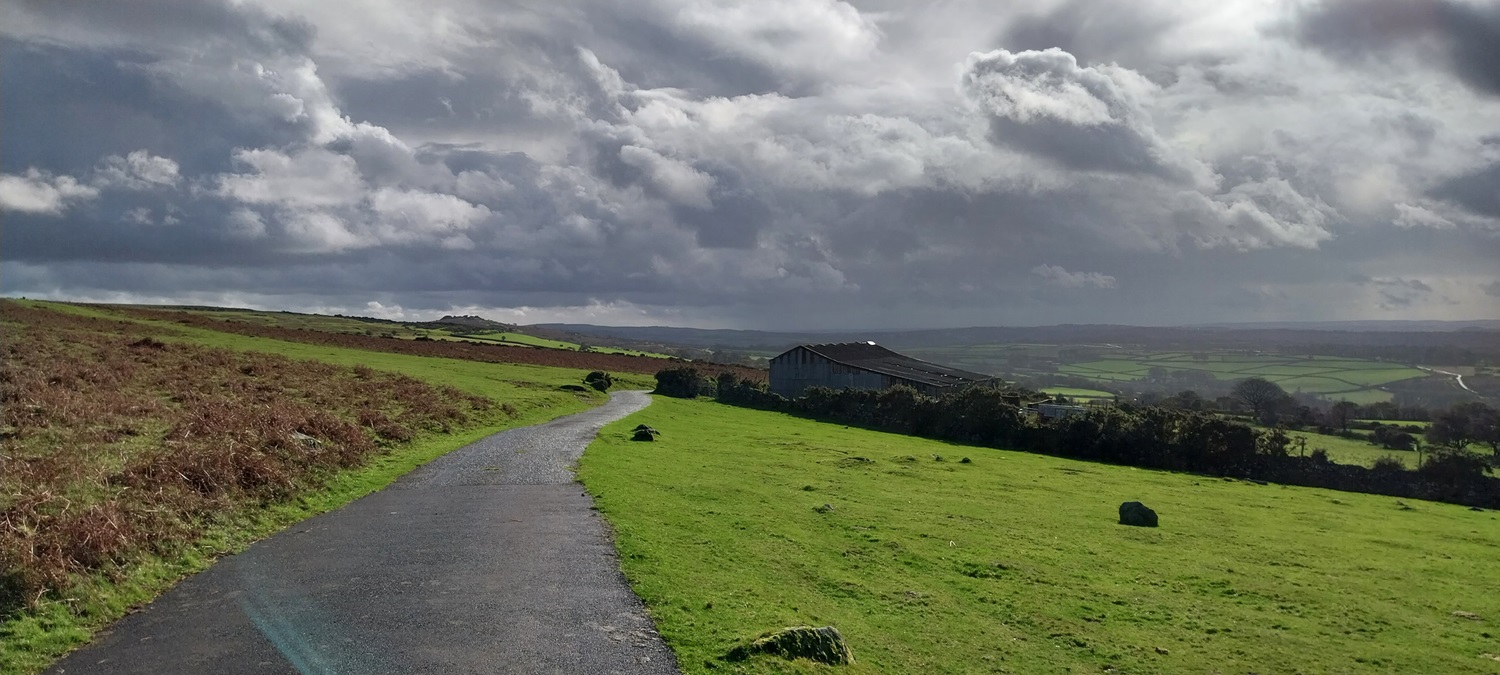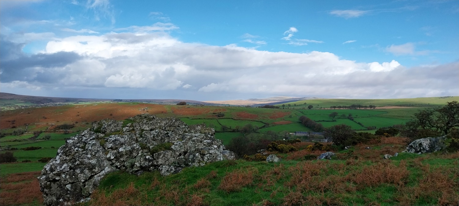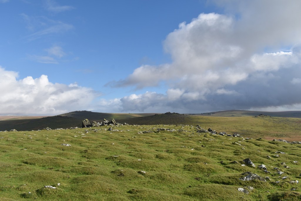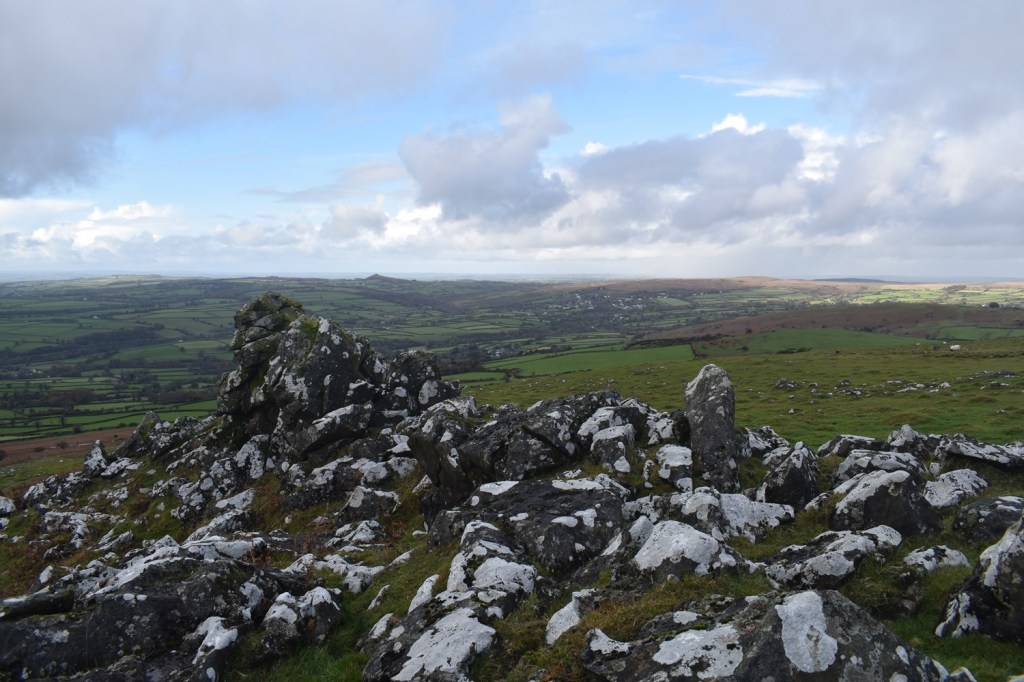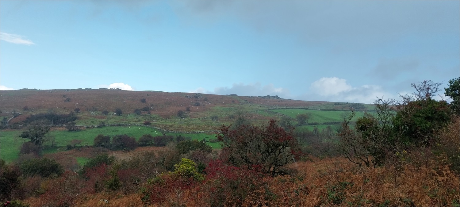 I’m enjoying our walks on this side of the moor recently and no doubt over the winter period we will look for others in this South West corner of Dartmoor. Setting out from Peter Tavy gives a few options for a walk, you could head towards Mary Tavy along the Dartmoor Way, or up to Boulters Tor or along the lanes to Harford Bridge or Cox Tor. There’s a good pub and a cycle cafe, so there is a bit there, alongside the imposing church and its 16th century Renaissance carvings. Recently I’ve omitted climbing Cox Tor from a number of visits to the Staple Tors, and this walk puts that right, as Cox Tor is a good summit for views. This would be walk number 38 of my second round of Dartmoor squares, it included L3, L4 and M3 in this one. Cornwall spreads out to the west and you get great views down to Plymouth as well, into Dartmoor you can see the Staple Tor, Great Mis, Great Links and Fur Tor as well. Another average length walk here, keeping in mind the shortening days and managing my Plantar Fasciitis to ensure it doesn’t flare up too often. This walk was beautiful with dark clouds full of rain, passing across the moors mixed in with sunshine piercing through, lighting up the tors around us. We managed to only get wet once properly, as we climbed Cox Tor, rain also came as we climbed to Great Combe Tor but we hid behind a bush and it was only a brief shower. Our lunch spot on Cox Tor was nicely out of the wind and gave us gorgeous views into the centre of the moor and across to the Staple Tors. All in all a fab day out and we will look for more of this type of walk during the winter months, especially with a pint at the end, like we had in the fine Peter Tavy Inn.