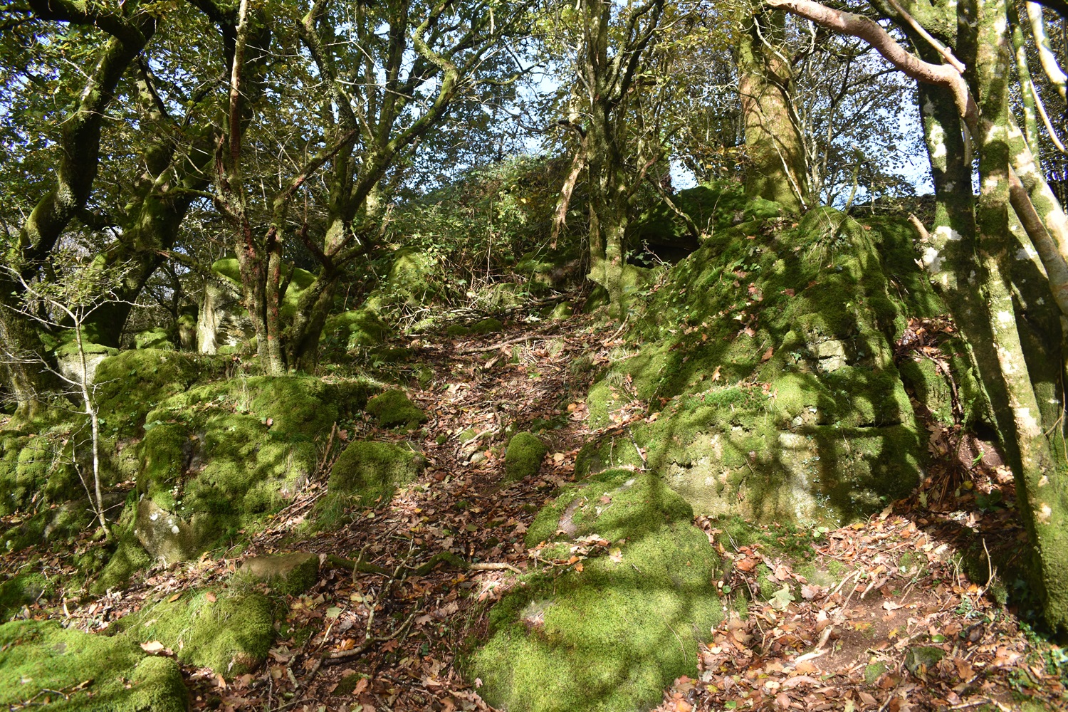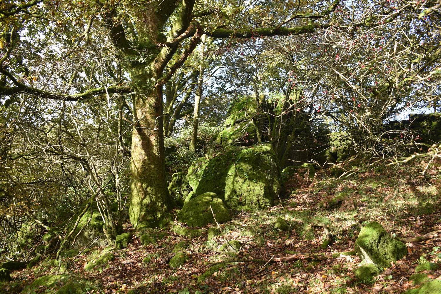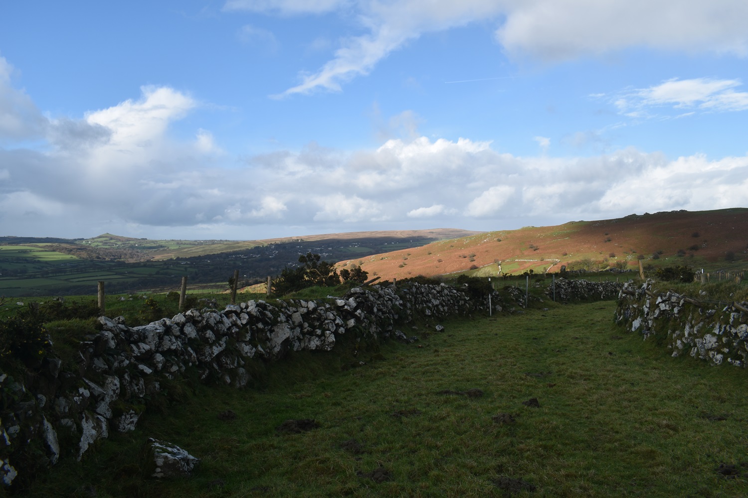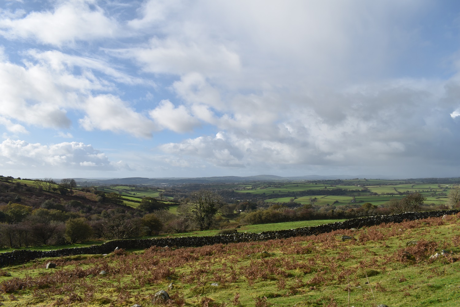 I’m enjoying our walks on this side of the moor recently and no doubt over the winter period we will look for others in this South West corner of Dartmoor. Setting out from Peter Tavy gives a few options for a walk, you could head towards Mary Tavy along the Dartmoor Way, or up to Boulters Tor or along the lanes to Harford Bridge or Cox Tor. There’s a good pub and a cycle cafe, so there is a bit there, alongside the imposing church and its 16th century Renaissance carvings. Recently I’ve omitted climbing Cox Tor from a number of visits to the Staple Tors, and this walk puts that right, as Cox Tor is a good summit for views. This would be walk number 38 of my second round of Dartmoor squares, it included L3, L4 and M3 in this one. Cornwall spreads out to the west and you get great views down to Plymouth as well, into Dartmoor you can see the Staple Tor, Great Mis, Great Links and Fur Tor as well. Another average length walk here, keeping in mind the shortening days and managing my Plantar Fasciitis to ensure it doesn’t flare up too often. This walk was beautiful with dark clouds full of rain, passing across the moors mixed in with sunshine piercing through, lighting up the tors around us. We managed to only get wet once properly, as we climbed Cox Tor, rain also came as we climbed to Great Combe Tor but we hid behind a bush and it was only a brief shower. Our lunch spot on Cox Tor was nicely out of the wind and gave us gorgeous views into the centre of the moor and across to the Staple Tors. All in all a fab day out and we will look for more of this type of walk during the winter months, especially with a pint at the end, like we had in the fine Peter Tavy Inn.