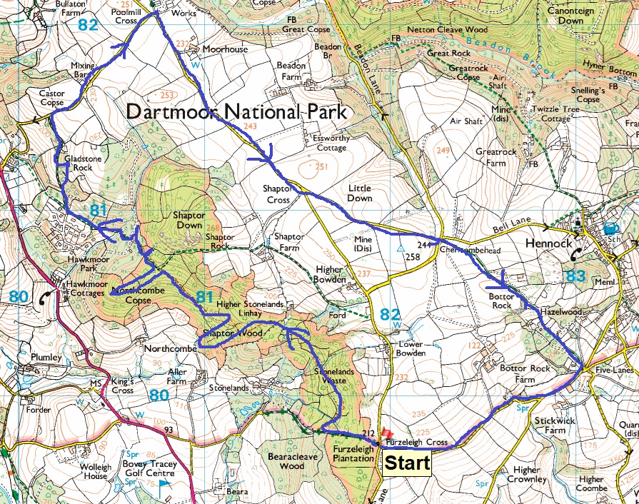 Route – John Canns Lane – Middle Stonelands TorAller Down Copse TorRooks Hole TorPixey Copse TorSonny Copse TorNorthcombe Copse TorWest ShaptorLong Cleave TorHawkmoor RocksGladstone Rock – Poolmill Cross – Shaptor Cross – Bottor Rock – Five Lanes – Furzeleigh Cross