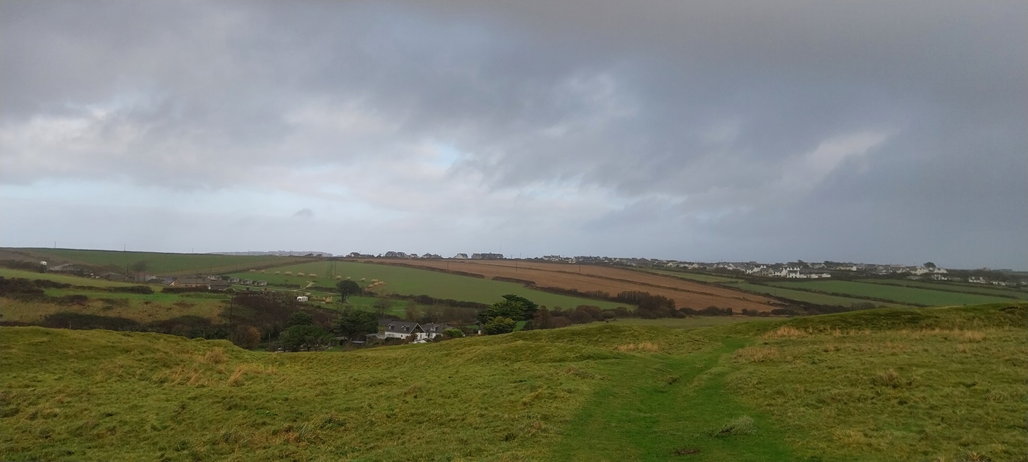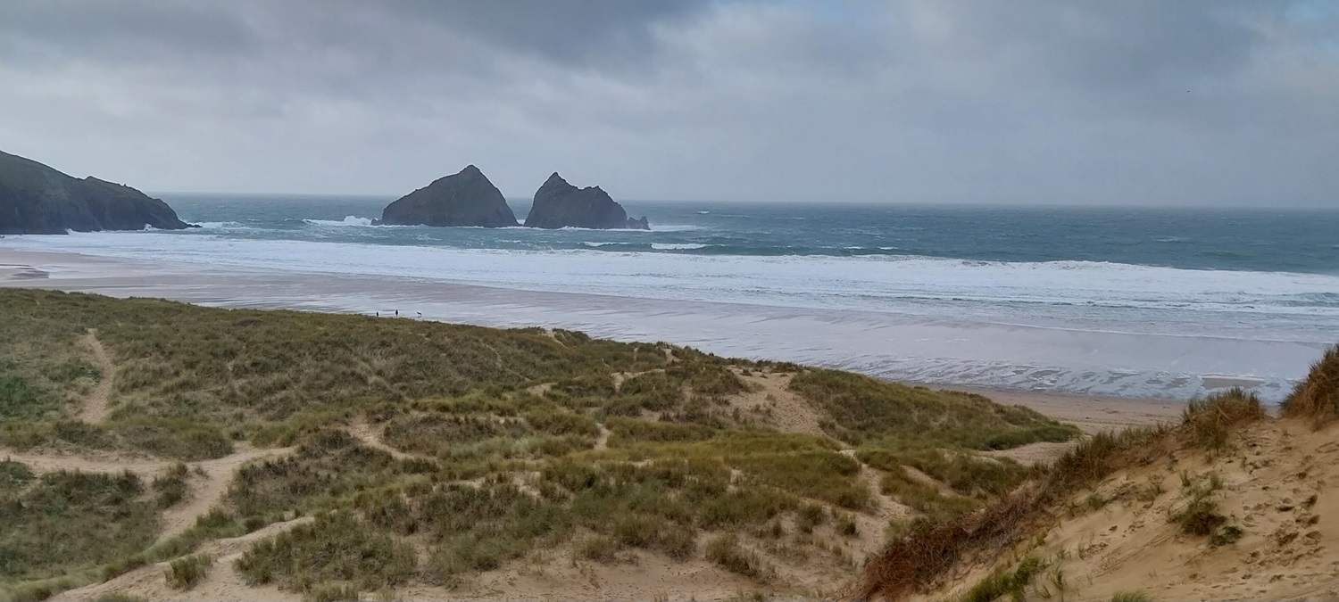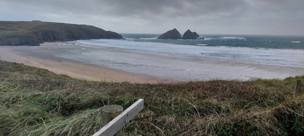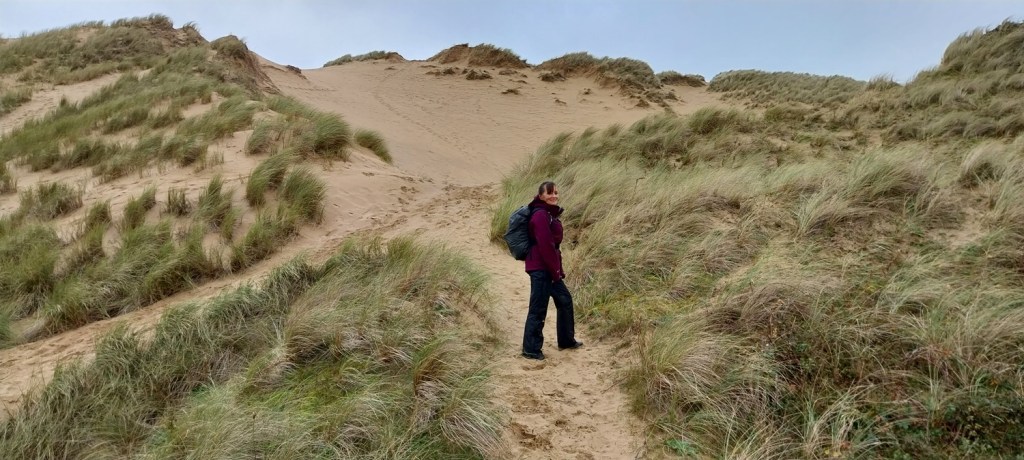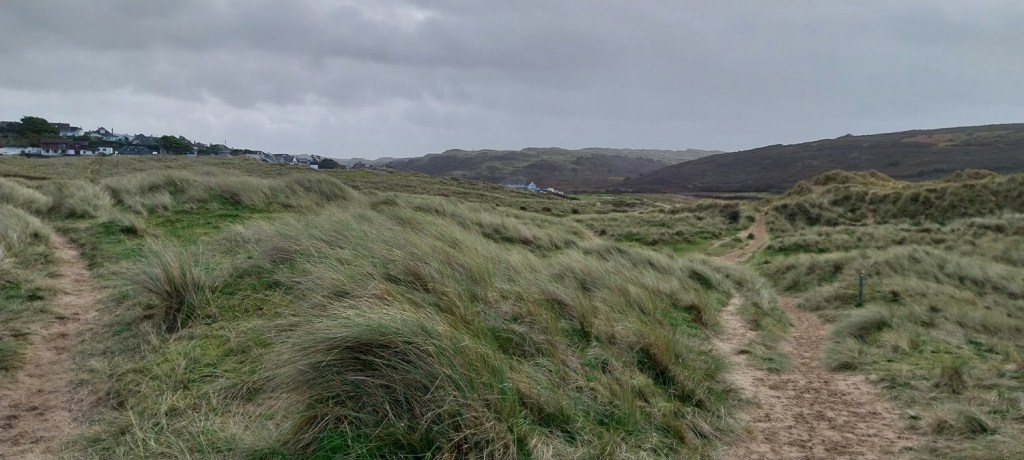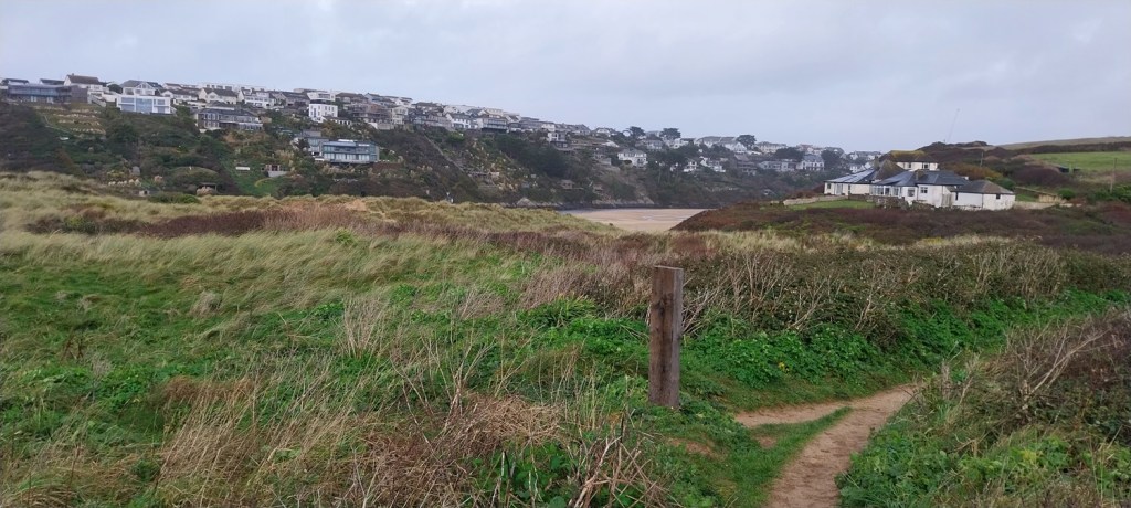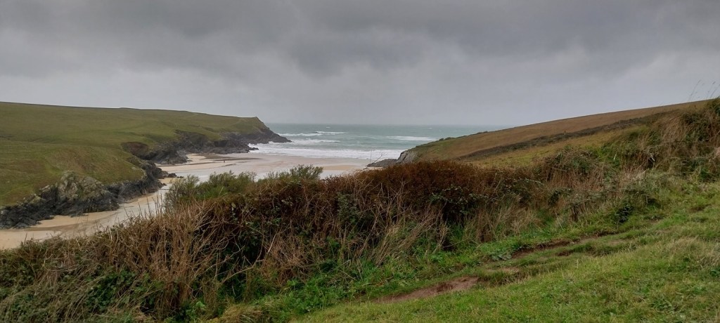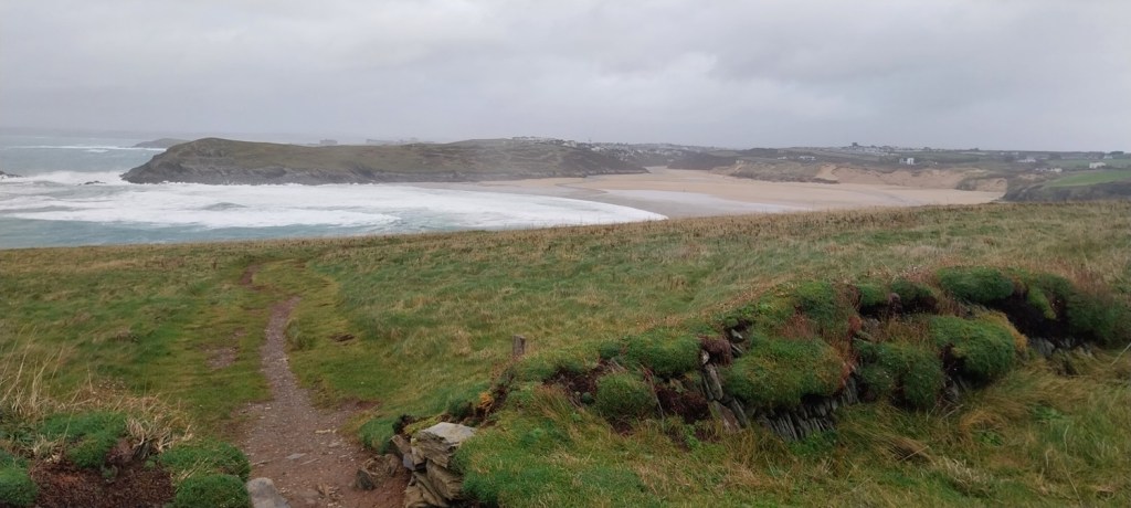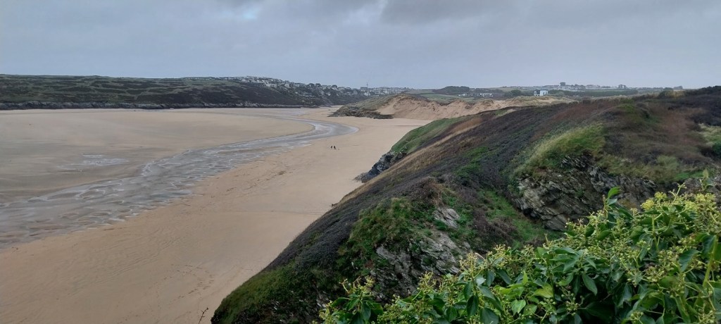 November weather has been, well, awful. Week after week of rainy days, even when they forecast a dry day, it would have heavy showers in it. Confidence on the reporting was low, as the weather companies only seemed to accurately report when it would rain all day. Photos online of cold frosty blue sky days in the Lakes and Scotland, had certainly not been replicated down here. As a result we have switched to walking in woodland and off the main part of Dartmoor for a bit, in fact the last time we walked on Dartmoor proper was 22nd October. This walk continued the recent theme, with rain forecast for parts of the day, so we stayed off Dartmoor and went to the north Cornwall coast, where the rain would be lighter and clear earlier. As it was we started in the dry, then it rained, then it stopped again. At least the majority of the walk was in the dry and the coastal sections were free from rain, which vindicated my decision to walk the inland loop first. The highlight of the walk is the dunes around Holywell, normally walking through dunes can be a slog as you feet sink into soft sand. However the path through The Kelseys was mostly firm and with good views, this made for some fine walking and some nice photos of the grassy dunes. The coastal path then leaves the dunes and rises to Kelsey Head, with the wind howling across this headland. Then just as you think the walk is nearing its end we reached Porth Joke and a small seal colony, getting a lovely view down to them on a secluded beach below. Porth Joke would be the quietest of the 3 beaches along this walk, being a fair distance from any car park, no bad thing for the seals. The other two beaches are Crantock and Holywell, with both places having a decent sized NT car parks, meaning they would be busier in the summer. Overall the walking here is very easy with not much in the way of rise and fall and great views along the coast, especially towards Newquay and Trevose Head. I’ve found out that driving to Newquay from Plymouth is about an hour so more walks near here are planned to help complete more of the coastal path.