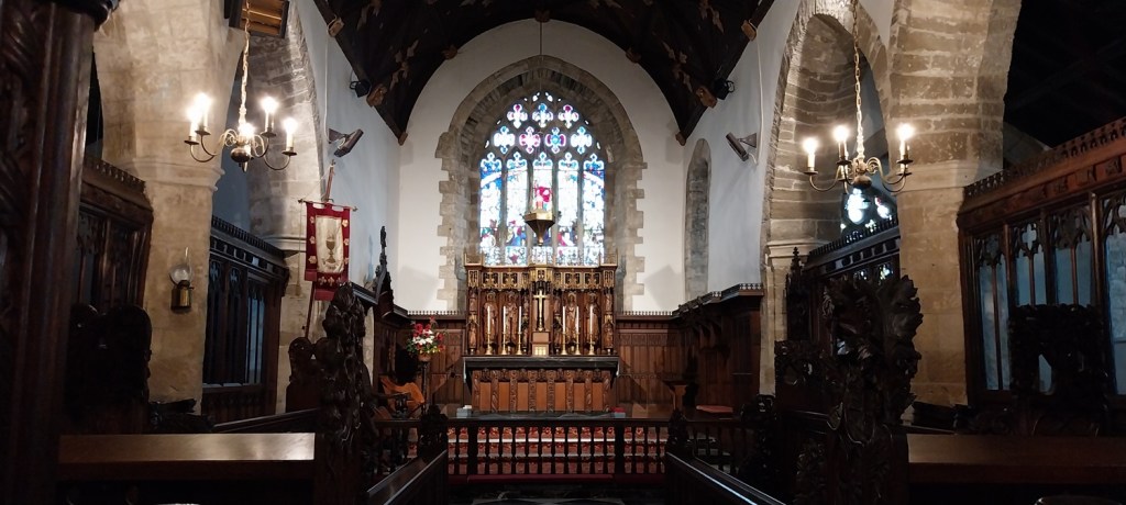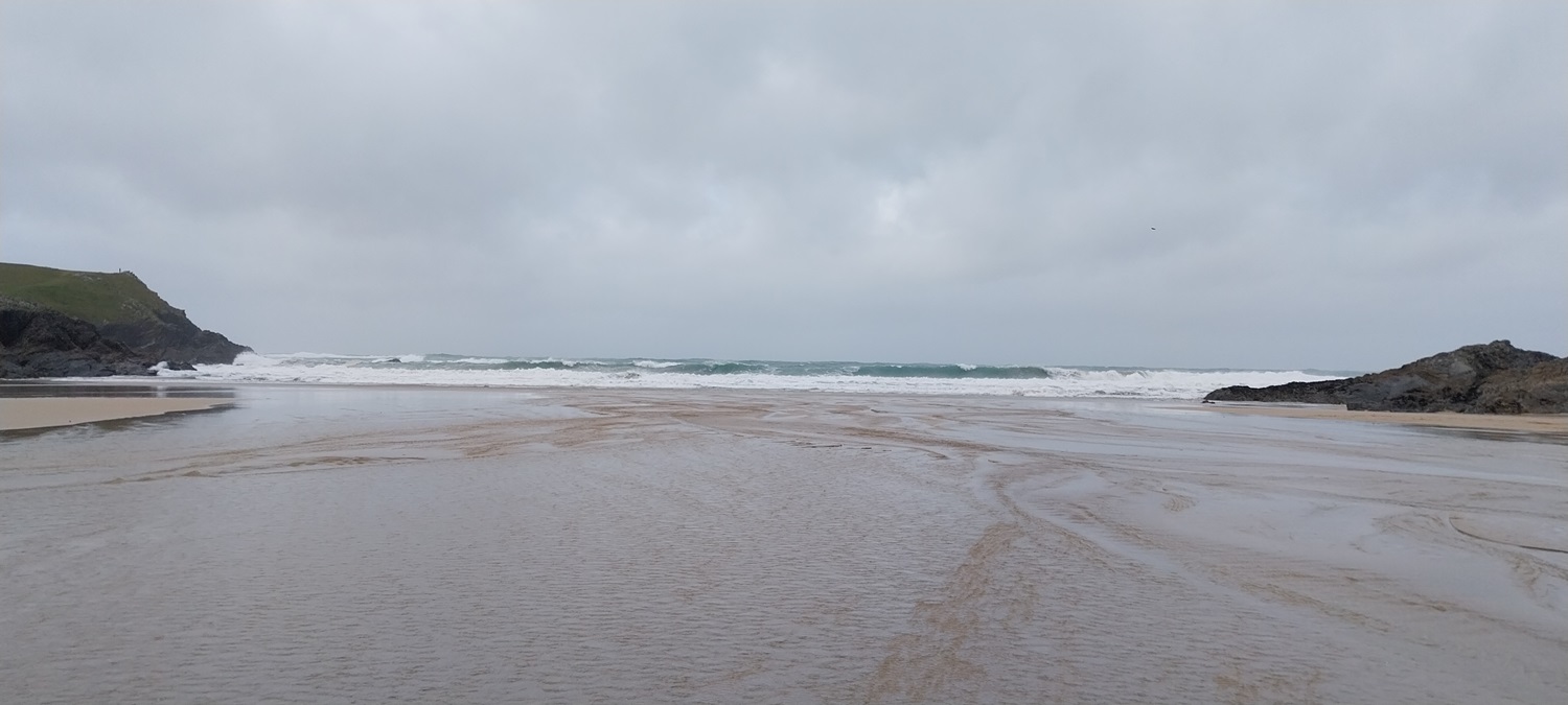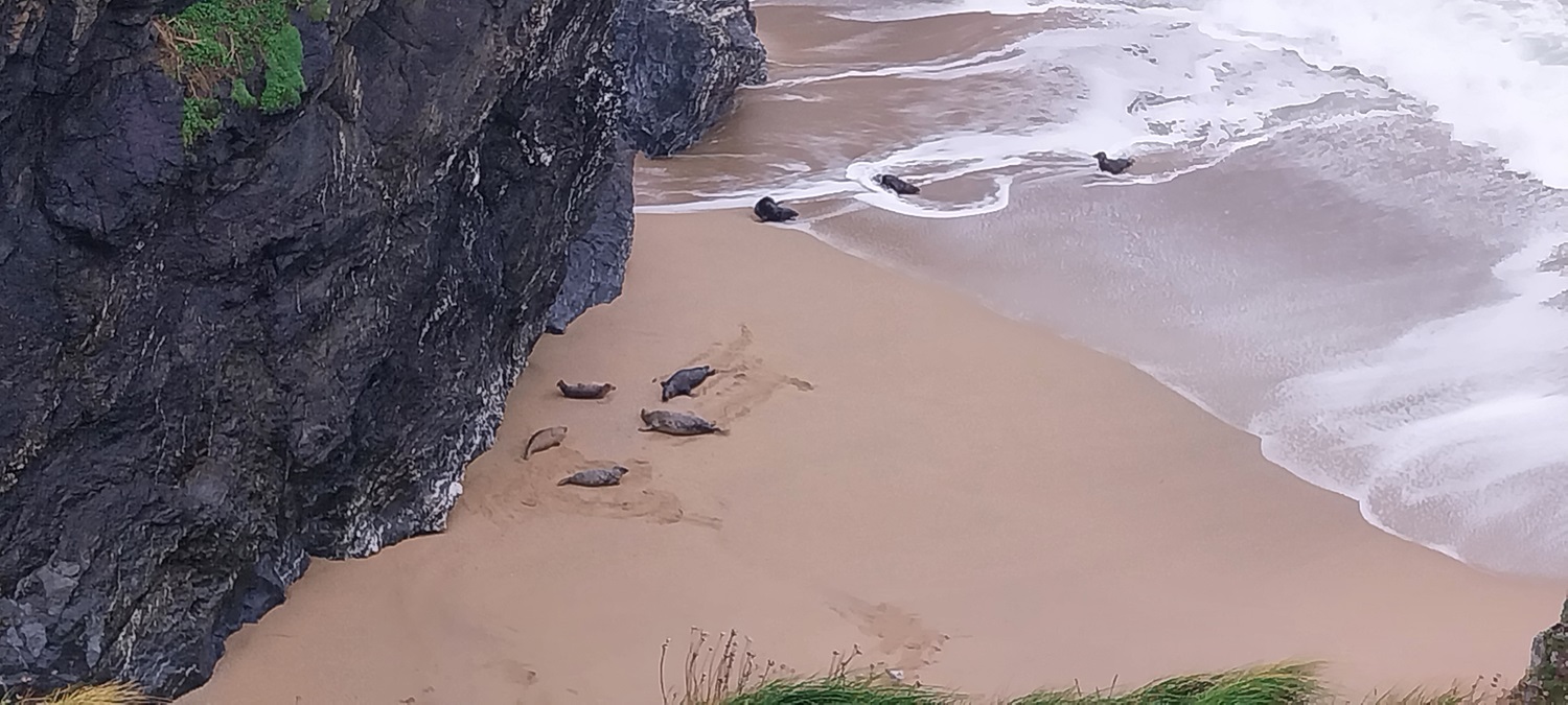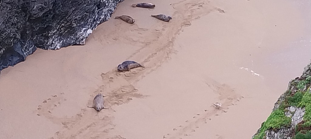 Crantock beach and estuary. The river on the right here is the Gannel, there are 3 ways to cross this river if you are walking here (Newquay is the bank on the right rising up). You can can a small summer ferry across which will land somewhere here. Further upstream is a crossing point which can be done at low tide, and a bridge further inland. We were heading up the estuary to look at the low tide crossing point. This photo was taken about 3 hours before low tide and plenty of the water has gone out and exposed the sand.Linda and The Gannel estuary, there were a few rivulets of water still running down, but nothing deeper than a couple of inchesFrom a point over there, running directly across the river is the suggested route across, possibly passing that post that is in the centre of the estuary. Next we headed uphill along a lane to Crantock.Crantock, the rain had been falling since we’d left the estuary so we had coffee in the bus stop, Remembrance poppies are wrapped around the tree. There’s two pubs here and a shop and post office alongside the thatched cottages and village hall here on the right.St Carantoc’s in Crantock. The existing building has parts dating from 12th century and a church of sorts has been here since the 6th centuryThe interior of the church, the font is also 12th centuryThe altar areaOutside are these stocks which date from 17th centuryAfter negotiating some cows we headed across Cubert CommonThat’s Porth Joke down there, dark clouds above heralded more rain at this point. Thankfully by the time we reached Porth Joke we had dry weatherAbout to head into The Kelseys, two happy but damp walkers.Linda giving some perspective to the dunes here as we walk into HolywellWe had lunch here on a bench by Holywell beach, I attempted to walk towards the sea and take a photo or two but the sand was being whipped across here by the fierce windsDunes, Holywell style, the village of Holywell is up there on the left. There a large bar/cafe on the beach and a pub in the village alongside the decent NT car park.Gull Rocks off Holywell beach, they were in view for a section all the way to Kelsey Head and made for a fine focal point for a photo. We could also see the waves were pounding in around here and the wind again was whipping up the sand into our facesNo surfing today, the swell and rough seas saw to thatHolywell beach and Gull Rocks off Penhale PointAs it says. We didn’t see any Kelseys, maybe they were hiding in the dunes.Lots of white water, crashing waves and wind hereFrom here you could see the sea pummeling the back of Gull RocksLinda is heading to Kelsey Head now, just out of shot on the leftFirst we rounded this inlet, the sea foam was getting blown up here to where we standPentire Point West across Porth Joke as we leave Kelsey HeadAnother photo showing the rough seas entering Porth Joke, the roped section in front of me wasn’t to keep me safe from the edge, instead it was for……………..these. Seals on a secluded beach in Porth Joke. It was around 3pm so low tide, and the sea doesn’t go out far enough for a human to walk over here. Before too long the 3 frolicking in the edge of the sea, had headed off to play fight in the waves. The other 5 slept as we watched them.One or two seals on the move for a better sleeping spotOn the beach at Porth Joke, again the odd rivulet would be running down the beach, necessitating a few jumps to stay dry.Porth Joke as we head out to Pentire Point WestOn Pentire Point West looking back across Porth Joke to Kelsey Head. The secluded beach is the inlet in the cliff over there, as you can see the sea is still rolling past that inlet. The island off Kelsey Head is called The Chick.Now heading down to Crantock Beach, the drizzle was just starting briefly here but it went as quick as it cameMore crashing waves on a small island next to The GooseStunning Crantock BeachThe waves were really rolling in here, there was one brave soul kite surfing across the beach and waves here. No issues with the amount of wind here, blowing a hoolieLast part now as we approach the dunes behind Crantock Beach. The River Gannel has two routes across this beach at times. This part near to me and the section that runs right up against the headland on the far sideNearly at the car now and the Gannel estuary briefly comes into view, looking drier than when we walked it a few hours earlier. A stunning bit of coast and we both really enjoying seeing it at its most untamed and brutal, alongside the dunes. More walks like this please.
