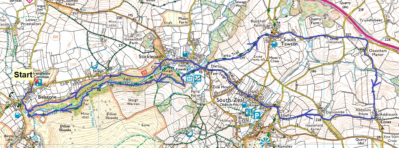Car park at Belstone, all dry now but not as we returnedWalking through Belstone, through the lovely cottages and housesBelstone villageThe stocks in Belstone Village, outside the cafeStarting out along the cleave and looking up to Belstone Common TorAnd again to Belstone Common Tor and the cleave below begins to take shapeOn the northern side of the cleave is this outcrop called The CliffBelstone Cleave below, and the top of Ivy Tor which we will pass on the way back to BelstoneWater spout in the cleave as we reach SkaighThere is also a spot to park here in Skaigh, useful to know for the summer months when Belstone is busyRiver Taw in full spateNice nativity scene inside St Mary’s church in SticklepathSt Mary’s in SticklepathI remember seeing this sign before in Crockenwell (the next point in this route). It marks the route of the messages being passed back to London to announce victory in the Battle of Trafalgar in 1805, part of Napoleonic Wars. A certain man, Lieutenant John Richards Lapenotiere landed at Falmouth with the news of victory and death of Lord Nelson, he set off post-chaise for London, covering the 271 miles on horseback in an astonishing 37 hours, changing horses 21 times.Finch’s Foundry, now a National Trust property, closed during the winter monthsThe lanes out of Sticklepath to South Tawton, here looking back towards Belstone Cleave, with Cosdon Hill rising up on the leftCosdon Hill (Beacon)South Tawton, the church of St Andrews and the church house to the leftSouth Tawton Mill, the leat on the right which fed the wheelOxenham Cross as we walk the lanes towards Oxenham ManorLooking back beyond Oxenham Cross to Cosdon HillCosdon Hill again as we rounded Oxenham Manor and headed to AddiscottAddiscott CrossHeading to South Zeal now which is down there over the hedgesWalking into South ZealThe high street in South Zeal. The AA sign on the left is for the Oxenham Arms, which is the old manor house of the village.The tiny chapel in South Zeal, St Mary’sSouth Zeal village cross and the chapel behindWe had walked back to Sticklepath and then joined a path alongside the River Taw before climbing through Skaigh WoodsMiddle Down Tor in Skaigh WoodsFollowing the path down to the River Taw, this is Tarka BridgeThis bridge has passages of the book, Tarka the Otter on the railings. The book was based here around the banks of the River TawTo get back on the southern side of the River Taw, we recrossed here on this wooden bridge, I’m not sure of the name of it, nor could I find anything online, so I’ve called it Ivy Tor bridge as it sits near that torRiver TawTwo very happy walkers, still dry at this point.Ivy Tor was up nextIvy Tor as we walk through Belstone Cleave againThe cliff across Belstone CleaveBelstone Cleave, Ivy Tor can be seen poking up on the rightLinda had managed to stick her foot deep in the puddle by this point at Belstone Cleave BridgeIts started to drizzle now as I look back up the River Taw, Cosdon Hill is again rising up to the leftWalking across Belstone Green, the Tors Inn is ahead but we headed for a warm drink in the car and a chance to take off someone’s wet sock. Another fab walk through some of the most beautiful villages on the moor. Come here in a summer evening when its sunny and any one of these villages will look stunning.