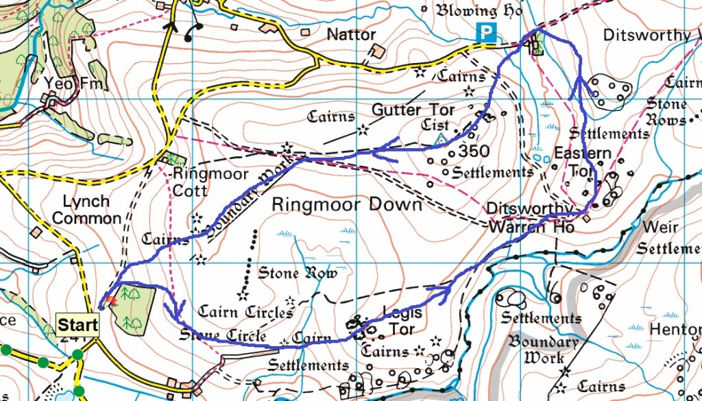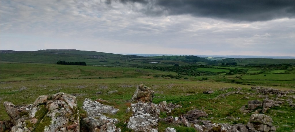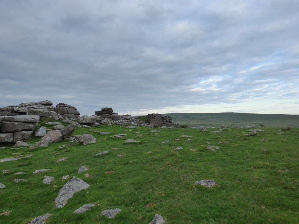 It was well into spring and we hadn’t been out for an evening walk yet, so time to put that right. The plan on any evening walk is to keep the driving and walking distance down, find somewhere that is interesting or looks good in different light and might have a sunset. With a mainly cloudy sky I wasn’t thinking about the latter of these but concentrating on a shorter walk and very little distance from home. To be honest I failed a bit on the walking distance, as its a bit further than I remembered around this loop, but as it happened it meant we saw a fantastic sunset as we got to the car. Some Dartmoor squares are included on this walk as well, this being walk 55 on the Dartmoor 365 round 2, picking up squares S6, S7 and S8. We started by walking around the Brisworthy Plantation and heading towards the stone circle of that name, before reaching Legis Tor. We sat for a bit on Legis Tor taking in the wide views in all directions, before then heading off for Ditsworthy Warren. Two tors sit just up the hill from here, both scattered rocks, rather than a clumped stack. Eastern Tor is the better of these, with Whittenknowles Rocks more of a scattered clitter of smaller stones. Next up was Gutter Tor and the high point of the walk as we passed the trig point. All that was left was the simple walk across Ringmoor Down to the plantation. Whilst walking past Gutter Tor we’d seen the gap in the cloud by the horizon, and wondered whether the sun would make an appearance. It did as we reached the car, so we stayed an extra 20 minutes and watched a lovely sunset. Perfect end to the Friday of the bank holiday weekend.