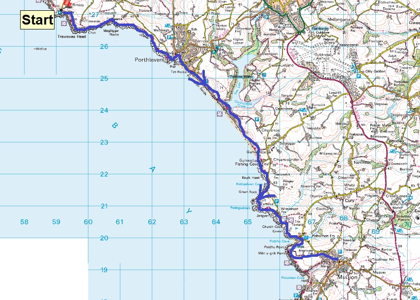 Route – South West Coastal Path – Wheal Prosper – Trewavas Head – Wheal Trewavas – Porthleven – Loe Bar – Gunwalloe – Halzephron Cliff – Church of the Storms – Church Cove – Poldhu Cove – Poldhu Point – Mullion