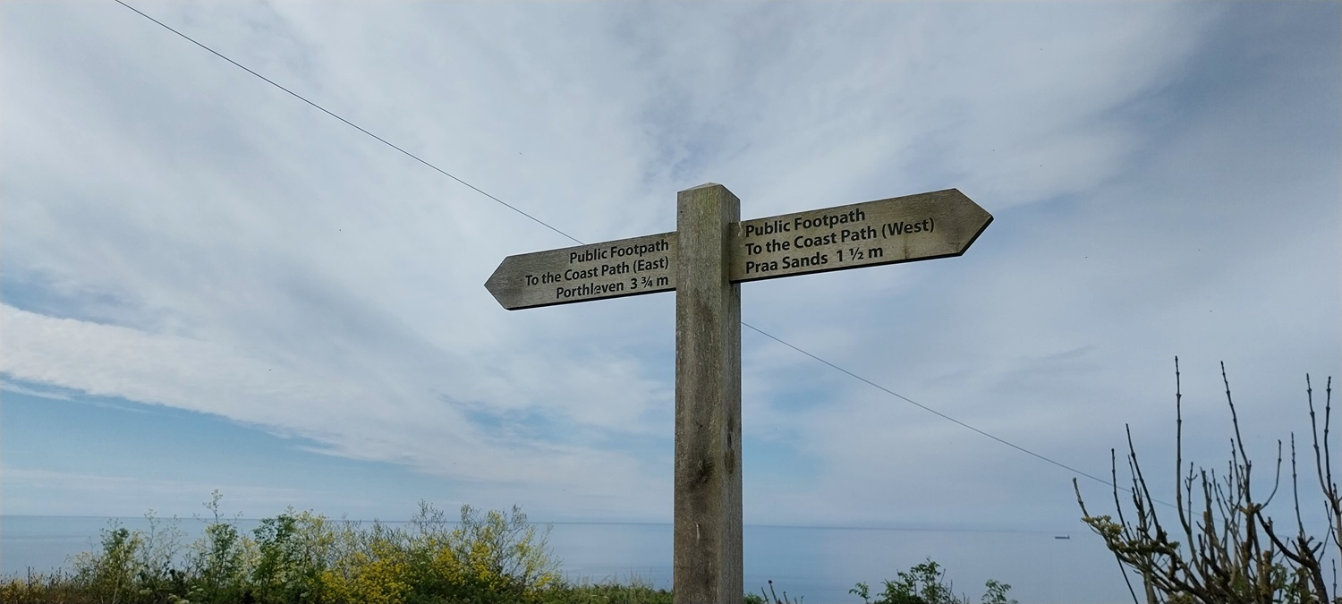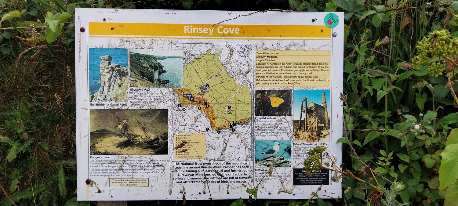 The sign regarding Rinsey Head and Cove as we walk through the hamlet of Rinsey heading back to the coastal path
