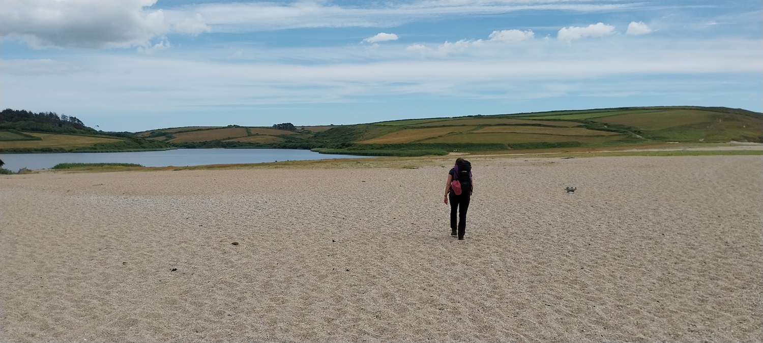 Loe Bar is below a mix of sand and small round pebbles, as you walk you sink in. Tough walking on the calf muscles