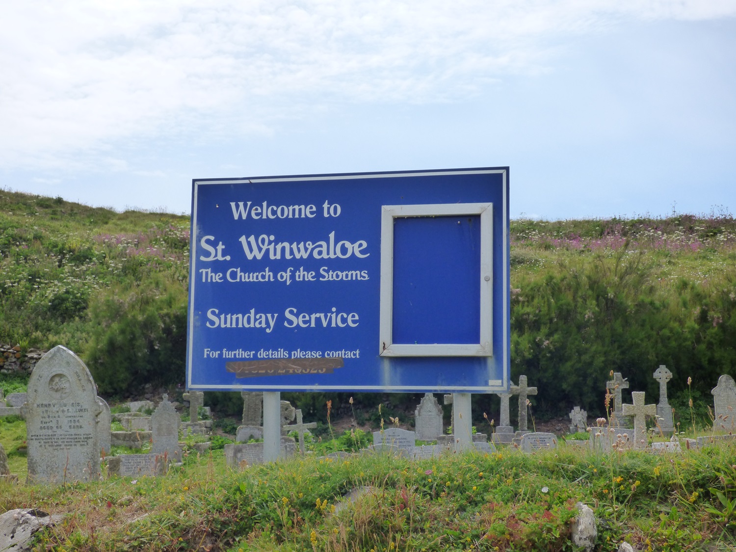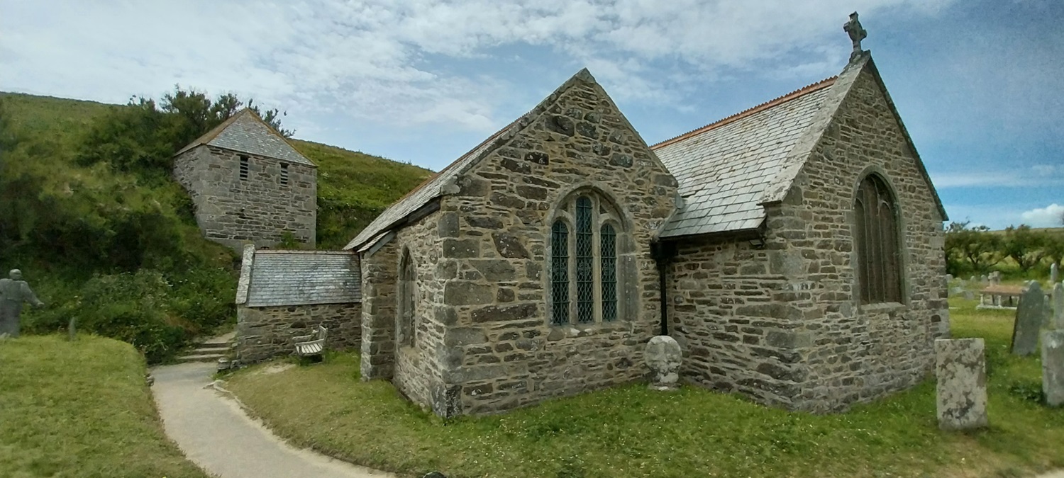 St Winwaloe, the large bank behind on its westerly side helps protect the church from the worst of the storms. the tower at the back is separate from the main church