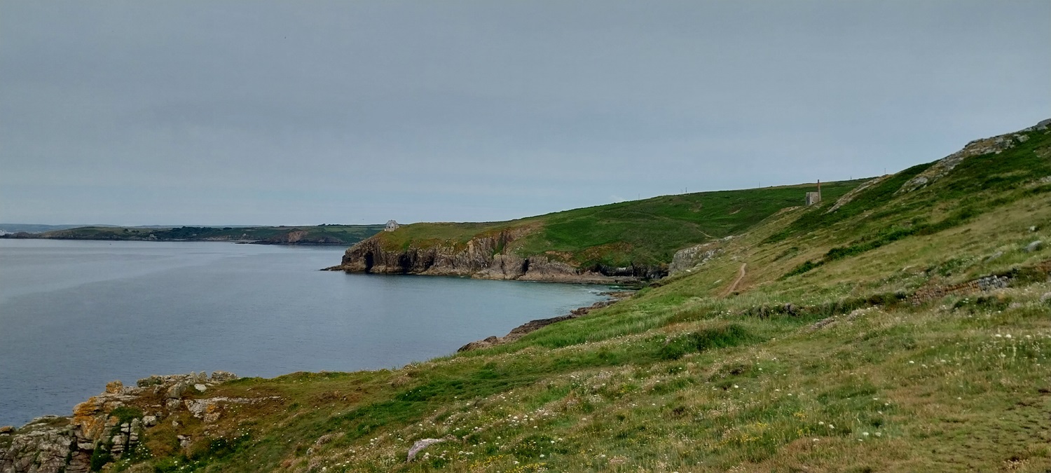 Quite dull and grey to the north, Cudden Point is the nearer headland, with Gwennap Head behind