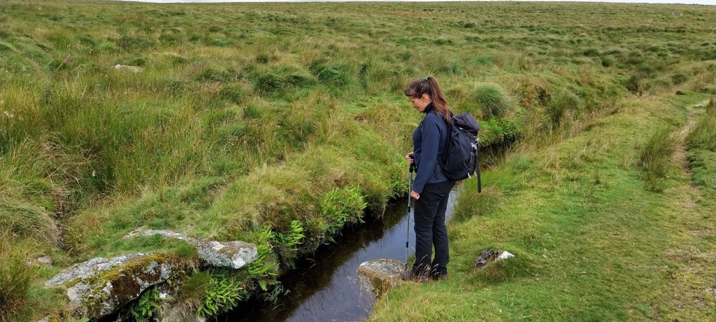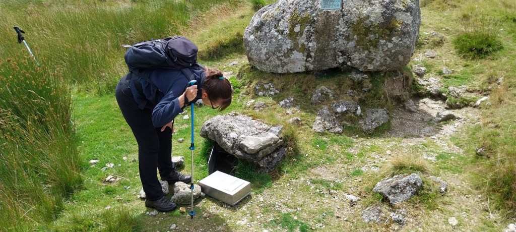 In attempts to bag any list (in this case my second round of Dartmoor tors/hills and Linda picking up her first) you can end up in some spots that aren’t that great. Back in April we did a walk around Trendlebere Down and to Water Cleave Tor, which was pretty rough to say the least, and more recently a really boggy bit of scrub land around Rugglestone Rock. This was another of these walks, and number 58 on my round 2 picking up Q9, Q10 and R10 on this route. The ground in the centre of Dartmoor is as wet as I’ve ever seen it at this time of year, and I doubt it will improve before the winter storms start rolling in during October. As we set off from Whiteworks we didn’t know it would be as bad as it was, and walking alongside the Devonport Leat we followed a good path that took us to Nun’s Cross, the path continues up towards Crane Hill before petering out on that hill. We’d managed to locate the Northmore Cross, a tiny little cross set into the top of a rock on this hill, and then we headed off to Plym Ford having stopped for a coffee near the source of the River Plym. Crossing the ford we climbed to Great Gnats Head before setting off across tussocks, boggy ground, long grass and a whole lot of featureless land towards Duck’s Pool. In previous years, alongside the historic letterbox placed here, there have been small yellow rubber ducks placed under the rock but these appear to have been removed. More barren lands took us down to Black Rocks and then on to Wollake Tor, truly some very isolated spots on Dartmoor. We had found some shorter grass on the walk to Wollake Tor and this continued north towards Green Hill, before again being replaced by tussocks and soggy ground. I rebuilt the cairn on Green Hill (as I always seem to do when I come here) before we headed off north, initially planning to get Fishlake Rocks and Nakers Hill. The terrain here was unforgiving and drained our energy, I canned the idea of Fishlake Rocks pretty quickly and soon followed that by missing out Nakers Hill, as the terrain deteriorated into acres of soft horrible bouncy ground. We wanted to just be out of there so turned towards Cater’s Beam (the hill) looking for the post that marks this area. If anything the ground around the post was worse, which says a lot as we’d walked a mile or so through thousands upon thousands of bog asphodel plants, their little yellow flowers providing the only feature in this area. finally we dropped on to the lower slopes of Crane Hill and a path back to Nun’s Cross and the Leat back to the car. So a very tough walk, and one that is unlikely to make any best walks list, but one that those with a positive mindset would call “character building”. At least it gave us some tough ground which would prepare us well for our Lake District holiday.
