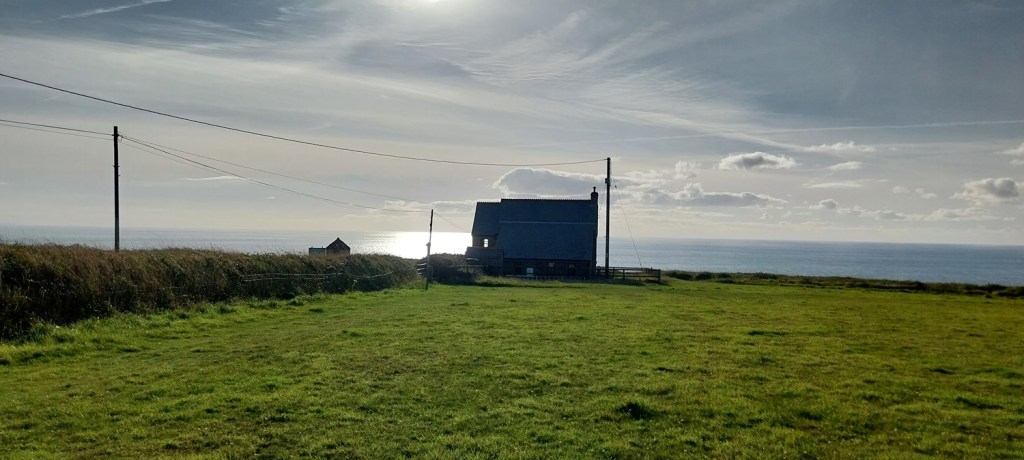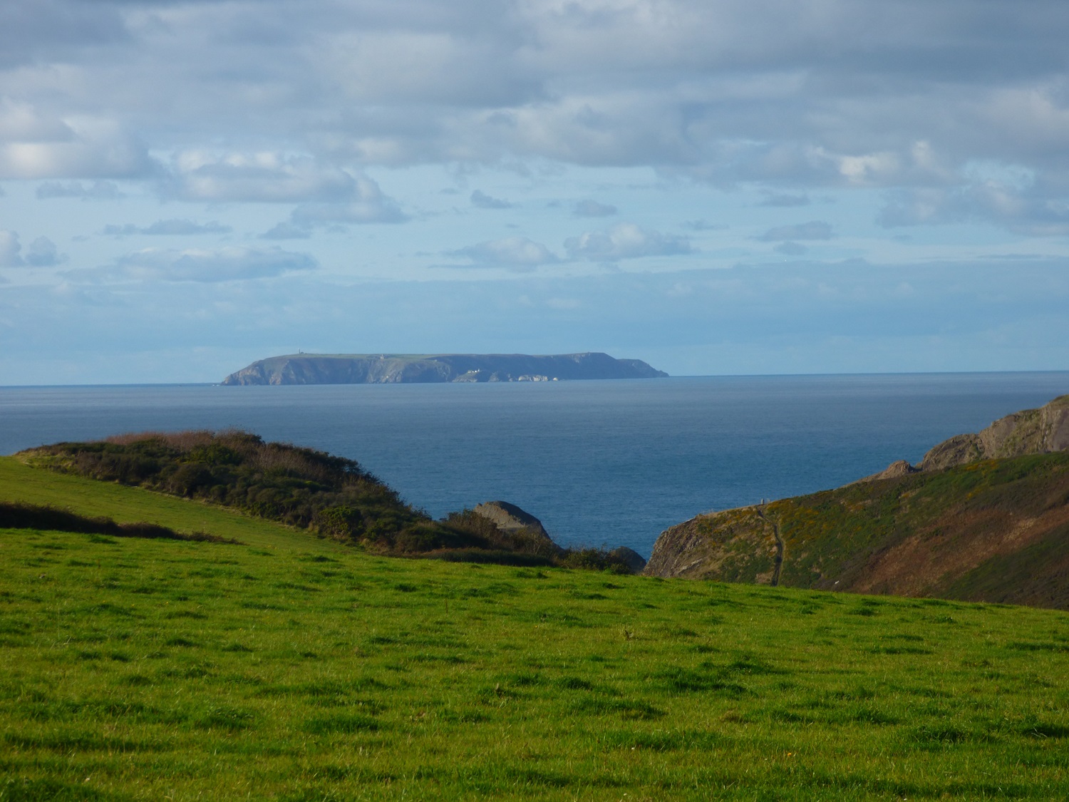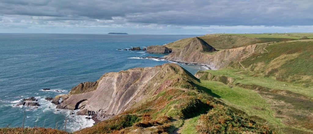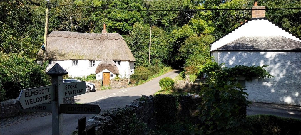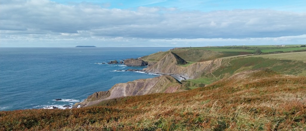 Starting out from Hartland, there is a town car park behind me (free as I type here). That’s St John’s Chapel, unfortunately not open on this Saturday but the bell was in full working order as we set out at midday.We walked briefly through the village before heading down a lane and then through woodland, there is a brook down to my left here, we would cross a bridge over that and walk through an open field. Before finding a good track which climbed the opposite side of this valley.Lovely Speckled Wood, it hasn’t been the best year for butterflies (possibly due to the amount of wet weather) but it was nice to see lots out on this day at the end of September.Newton Cross, we were taking the Elmscott route and passing Docton Mill, which meant I was singing Doctor Mill, Doctor Mill in The Timelords fashion from 1988.Linda wasn’t impressed by my Doctor Mill version of the song so headed off Through one of the gates we captured our first glimpse to Lundy away in the distanceLymebridge, a lovely little hamlet on routeEdward 7th post box from 1901 to 1910 located after passing Docton MillAcross North Devon fields, some lovely blue sky and clouds aboveYouth Hostel in ElmscottLundy stands proud out to sea as we near the coastal path. Its been a few miles of walking to this point alreadyHeading up from South Hole to the coastal path, we see what views we could have been treated to the last time we came here, 18 months beforeIt was 2pm so we needed lunch and there can’t be a better bench and table in this country to enjoy a sarnie.Absolutely gloriousLinda is happy and is tucking in already! The cliffs which run down towards Bude are beyondAfter a fine lunch with astonishing views we continued on, a Small Copper gave us our second butterfly species of the day.Linda looking to LundyThe sunshine gave a great sparkle to the sea and the dramatic cliffs a fine sheer edgeLooks a bit like an Agaric mushroom but to be honest I haven’t a clue.A nice bench overlooking some raggedy rocksThe bench is behind me and the rocks down there still hold part of the ship which came agroundAs we reached the edge of Mansley Cliff we looked down to a lovely spot. The pointy St Catherine’s Tor stood out backed by Lundy.And descending to Speke Mouth the terrain became more lovelySpeke Mouth, the drop down was quite something being so close to the sea, this is a result of the rock here being so hard and the pounding waves and constant stream not able to carve a wide estuary as it normally would instead it meant you got something special……..