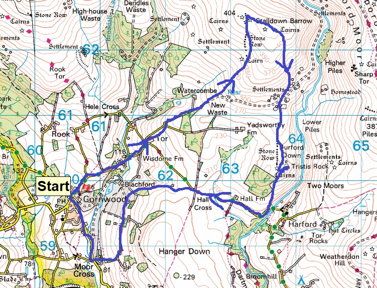 Route – Wisdome Bridge – Tor – New Waste – Stalldown Barrow – Stalldon Stone Row – Hillson’s House – Burford Stone Row – Tristis Rock – Hall Farm – Moor Cross – Cornwood