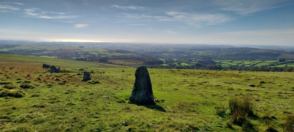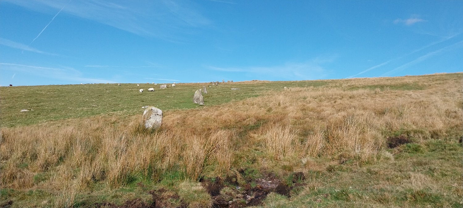Burford Stone Row, or the far end of it by Tristis Rock, looking back at Stalldown Barrow