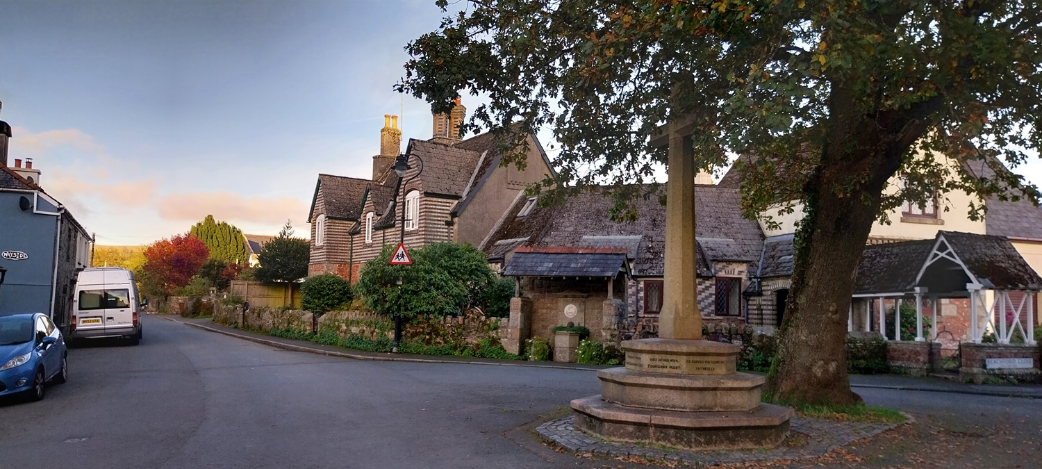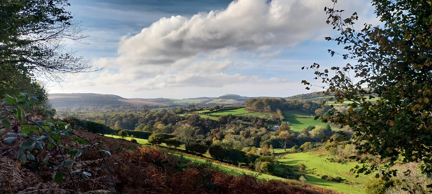 The village of Harford hidden in the trees, Western Beacon up to the left