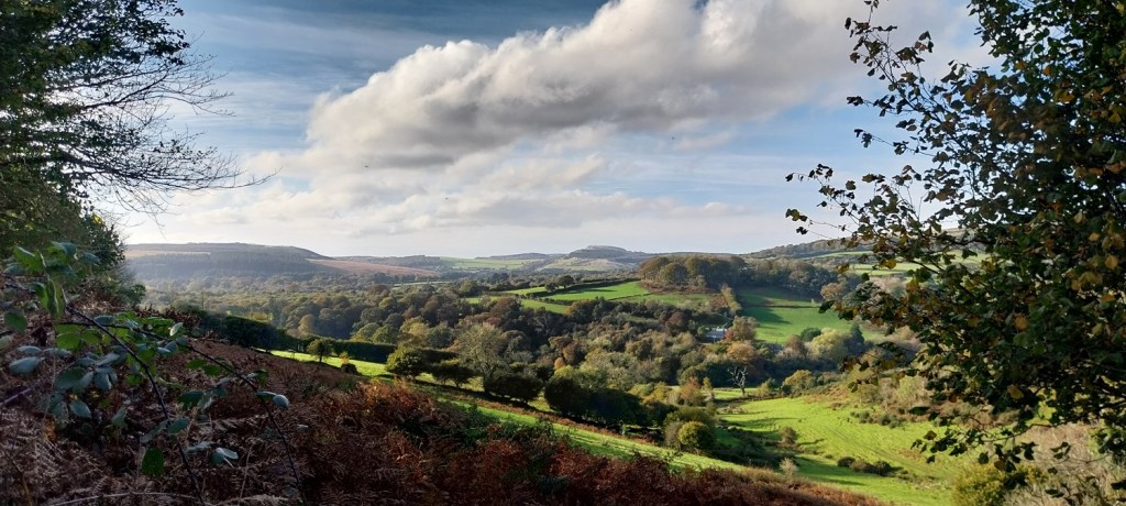 Late October, and when the weather is as good as this, it would have been a serious error not to head out and walk on Dartmoor. This despite us being in the middle of packing ready to move house a few days after this (the results of the packing can be seen on the previous walk around Fingle Bridge), sometimes you just need to outdoors to help give you a bit more energy, knowing that it could be a few weeks before your next walk. With all the packing however, it meant we didn’t want to travel too far, so the south west corner of the moor is perfect for a quick drive. Cornwood village would be our starting spot, heading up to Stalldown Barrow, along the lanes. This would be walk 63 of a packed Dartmoor 365 bagging outing on Round 2, and ticking off squares U10, U11, V9, V10, V11, W9 and W10. Our route back would be along more of those lanes, so I decided to try and pick up a path that headed roughly towards Cornwood. It started well (you know what’s coming next when someone starts a sentence with that!), however we should have taken a path running downhill, but we weren’t sure it was permissive, as it looked like a driveway and looking at it now I’m still not sure. So it meant a slightly longer detour back to Cornwood, via Moor Cross. Still even this didn’t detract from the stunning weather and some lovely colours on the trees, which always look better with some sunshine shining through the autumnal leaves.