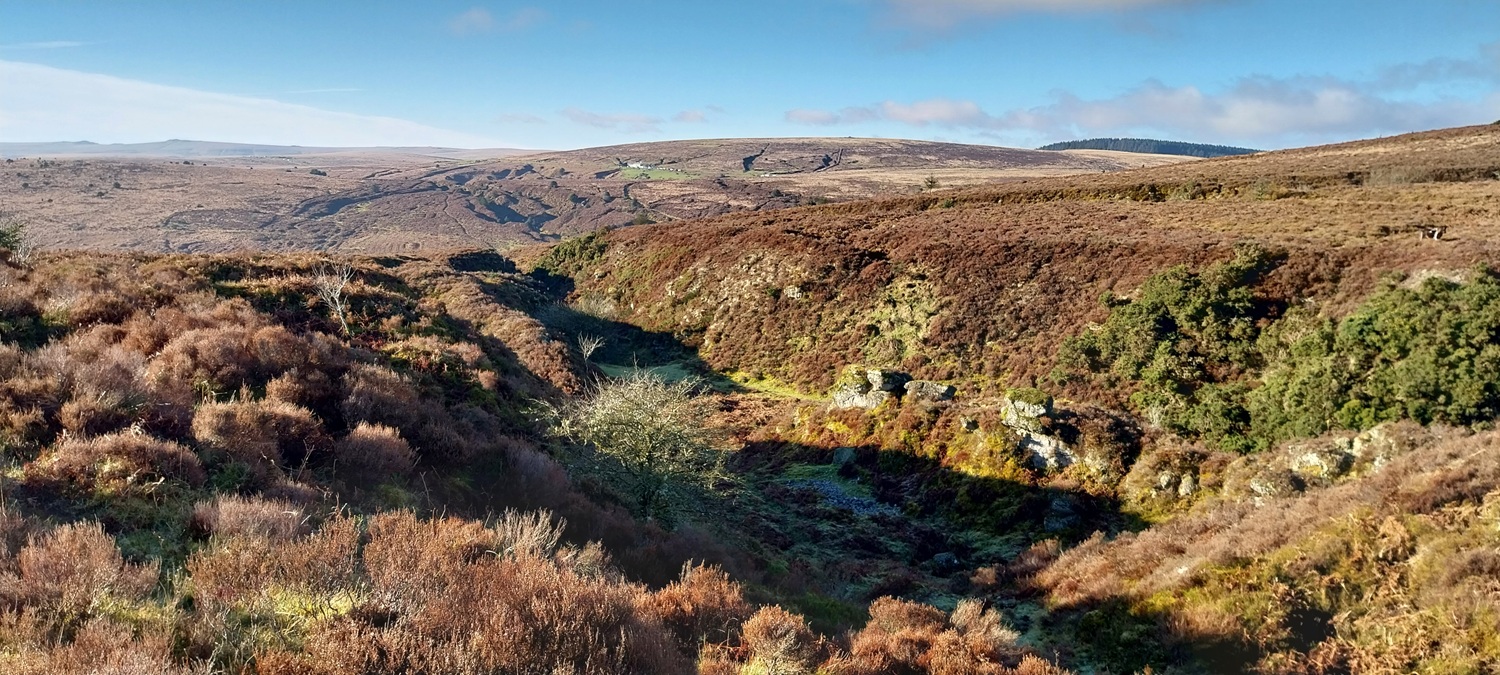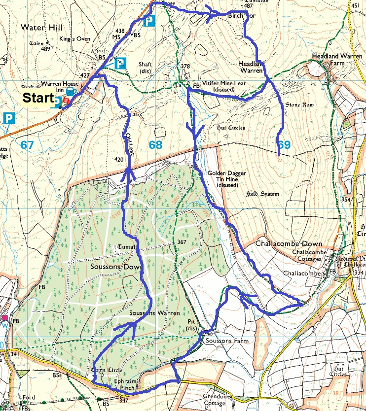 Route – Bennet’s Cross – Four Aces – Birch Tor – Chaw Gully – Challacombe Stone Row – Challacombe Down – Chaw Gully – Vitifer Mine – Golden Dagger Mine – Soussons Down – Ephraim’s Pinch – Soussons Cairn Circle – Soussons Forest – Vitifer Mine – Warren House Inn