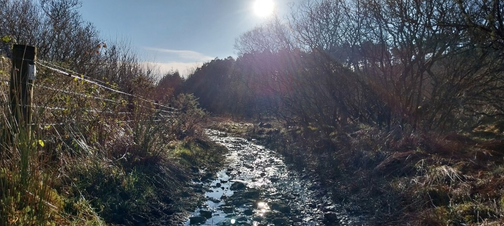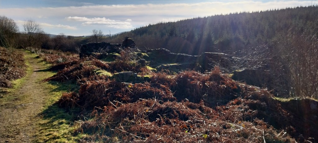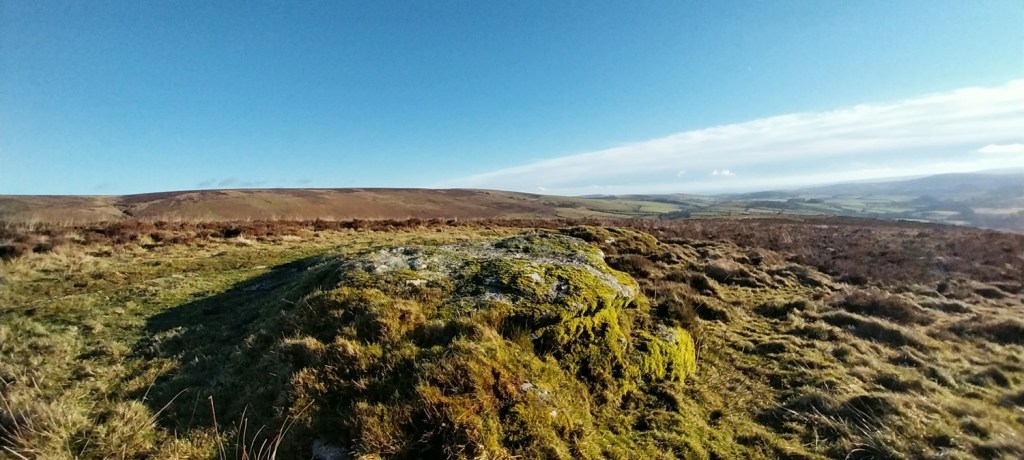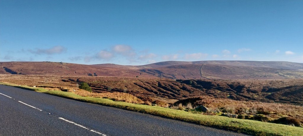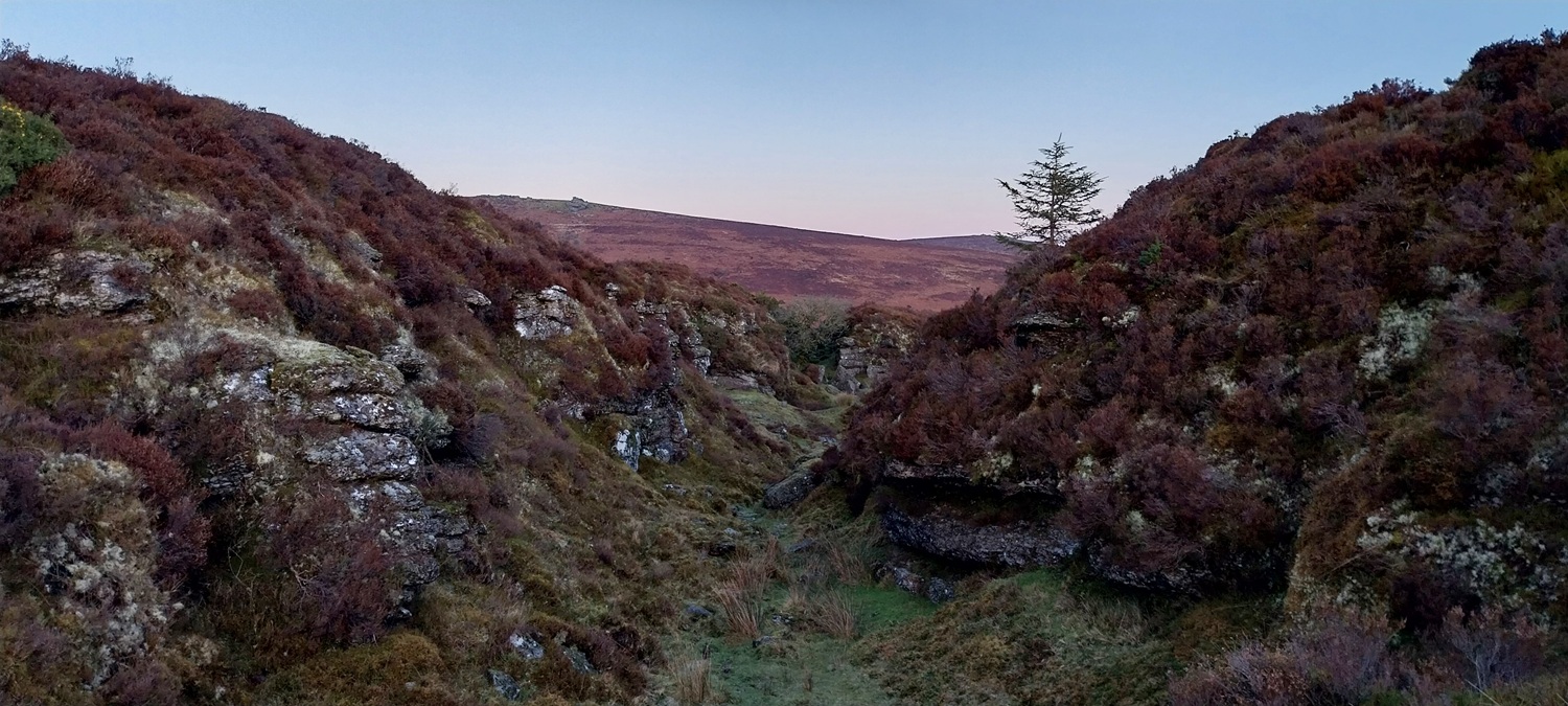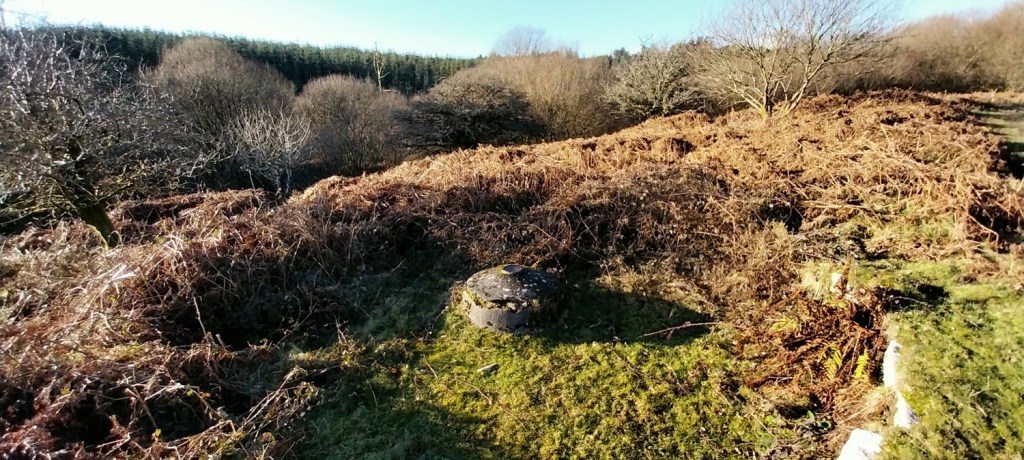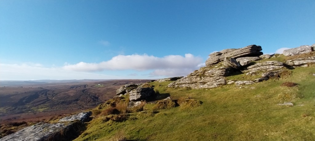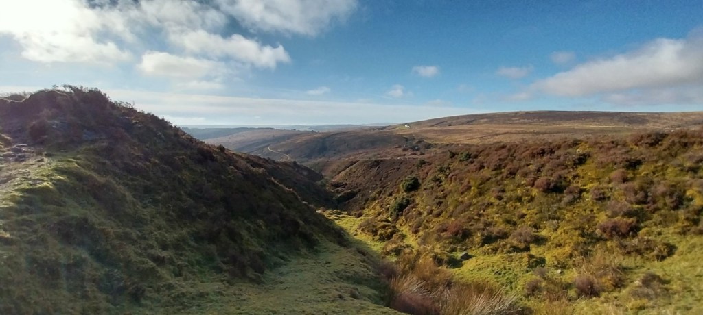 So it was time for our first walk in 2025 and the weather was playing ball. Clear blue skies and cold, perfect winter walking weather. This walk was done before the snows hit most of Britain, with even Dartmoor getting a fair bit, closing the road where we parked on this walk, for a few days. This is a nice variation of tors, mining history, woodland and a good pub to finish, the Warren House Inn. This walk is number 66 on our Dartmoor squares collection, picking up I13, I14, J13, J14 and K13 and we started out by parking just down the road from the pub in a small pull off car park, and walked past the pub towards Bennet’s Cross. A path heads off from there towards Birch Tor, passing the first of our Dartmoor 365 squares, Four Aces. These are 4 strangely shaped low walled fields on the slopes of Birch Tor, we sat on one wall for a coffee to enjoy the views towards Princetown. Next was Birch Tor itself, always a superb outcrop and giving lovely views along Challacombe. We then dropped to Chaw Gully passing across the top of the gully and climbing Challacombe Down and its triple stone row. This is only one of two triple stone rows on Dartmoor, and not as easy to see as the one on Cosdon Beacon, due to the vegetation. Before long we hit the top of Challacombe Down and sat for another coffee by the wall. This wall would be visited again later, but it wasn’t planned. We descended back to Chaw Gully, admiring its deep cut into the side of the hillside, a result of the heavy tin mining in this area. Next we headed towards Golden Dagger Mine, along some very soggy paths. Thankfully the running water and boggy ground didn’t last long, and soon we reached the mine buildings of Dinah’s House and the Engine House.