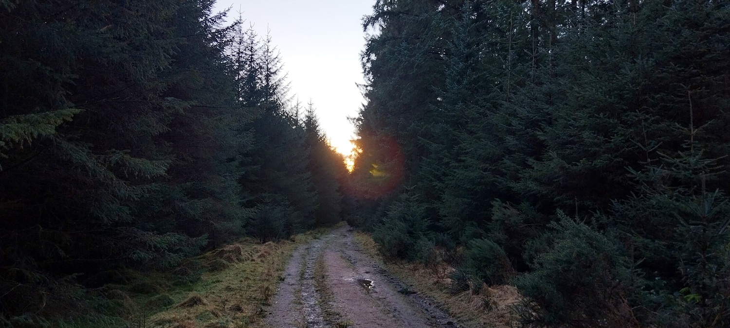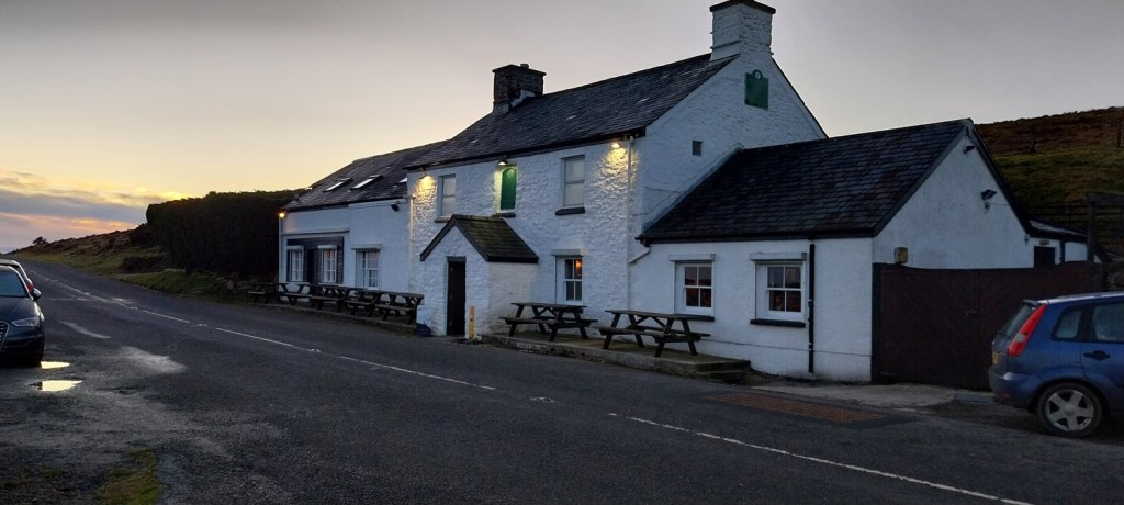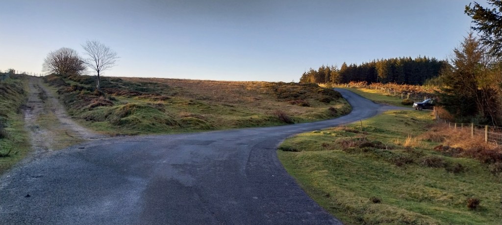 Stopping here for lunch as it was in the sunshine, we explored the buildings, leat and Engine House. Fed and watered we started off again up the path towards Challacombe and Soussons Farm, a gentleman was walking towards us and he stopped and put his bag down, alongside his camera. CAMERA!! I’d left it at the top of Challacombe Down where we sat by the wall!! I was off steeply uphill, to get the camera, 130 metres above me and back to Linda in around 30 mins. Luckily its a very quiet spot and it was still in situ and I was able to visit the two rocky outcrops on Challacombe Down during the return back. The detour had meant we were behind on our walk so we sped off to Soussons Farm and Ephraim’s Pinch, before entering the forest plantation. The sun was getting low as we walked through the dark fir trees before emerging from the forest by the trenches of Vitifer Mines. A quick walk had us at the pub and a much needed pint to regain our strength. It was pretty much dark as we walked the hundred metres to the car, and as we drove the moon and Venus shone brightly above us, we stopped to look and took a photo of the closed Dartmoor prison. Closed due to high levels of radon, which naturally exists in granite and always has. Clowns in charge of the asylum (or prison!).