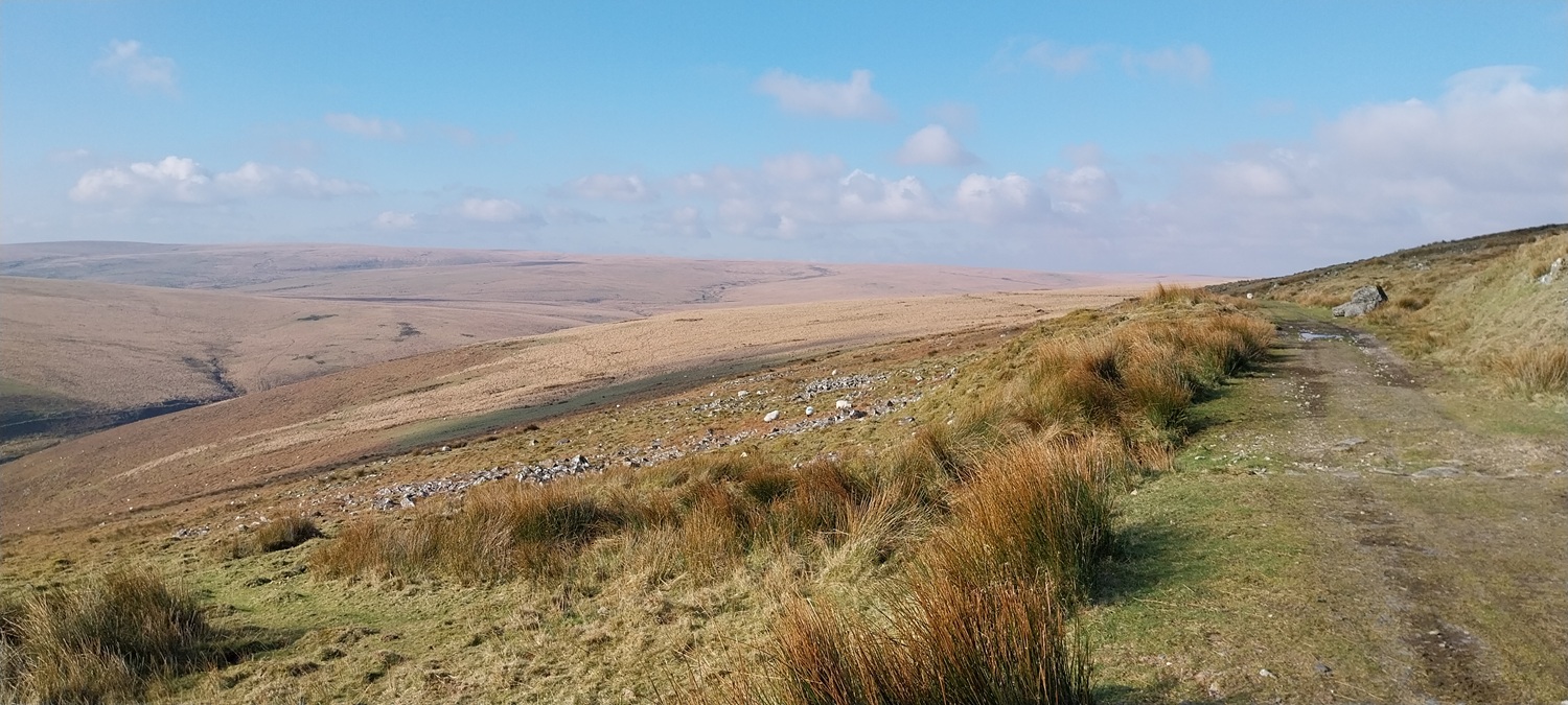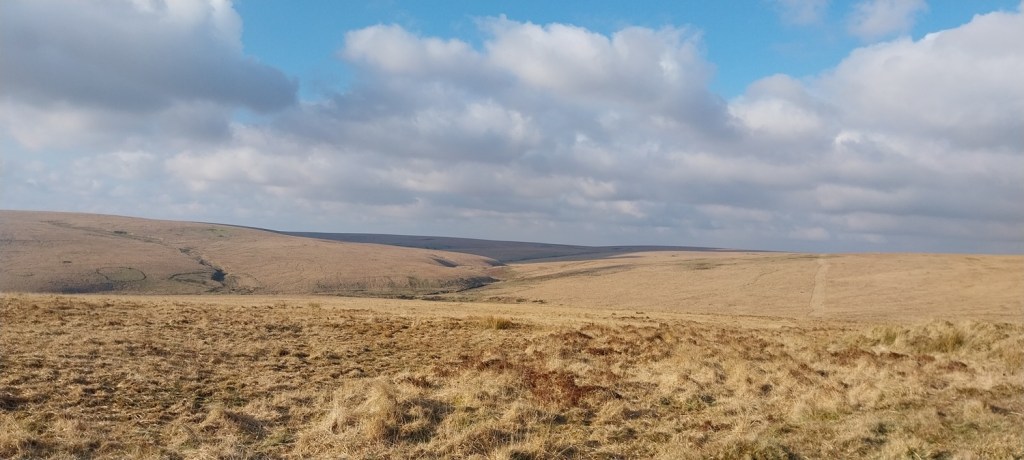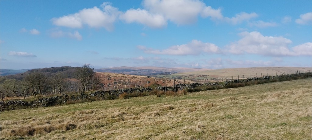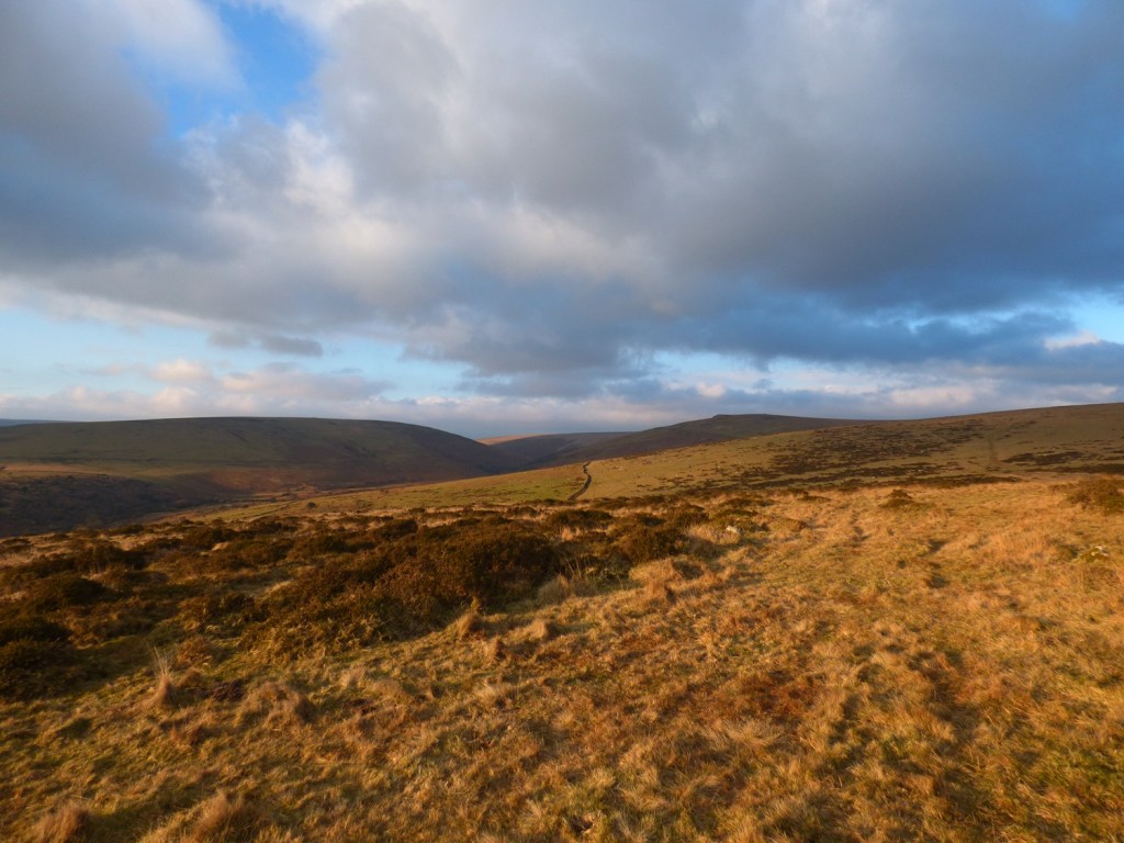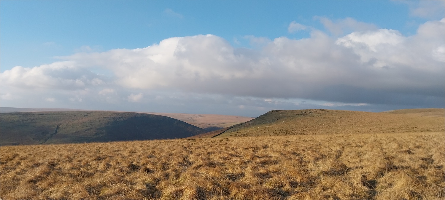 A fine weather day and a chance to get out, walking plans were made and forecasts checked. The forecast had blue skies in the morning, with cloud building from the east as the day went on, so we were planning on a trip to the west around Lynch Tor and Stannon Hill. A really poor nights sleep before however, with some very low blood sugars had us both waking up late, and only ready to leave the house around 11.45am. A new plan was rapidly hatched with an out and back to Quickbeam Hill from Harford, the area famously owned by those that want camping, picnics, sitting and other loitering activities to be banned from the moor. They have closed car parks to make things more difficult but all that has happened is people park in the hamlet of Harford, a few hundred metres down the hill, annoying the locals. Parking up in Harford, we had sunshine as we pulled up and the walk was mostly in the sunshine, and the cloud wasn’t too bad on this side of the moor, but we’d missed the clearer skies in the morning. That said this is a simple walk and once you reach Harford Moor Gate, you turn half left and up the long pull to Piles Hill, before a hop, skip and jump to the old Puffing Billy railway track, which would take you out to Red Lake. This is a long path (also part of the Two Moors Way), winding its way through yellow grasses, rolling hills, streams and very typical Dartmoor landscapes, only one tor to be found along this track. Our plan was just an out and back so we avoided the deviations to Sharp Tor or Three Barrows, preferring to stay on the track. Once out at Quickbeam Hill, we stopped for a late lunch, about turned, and headed back for the car. Its another hill ticked off for Linda and a couple of Dartmoor squares, but not a walk that needs to be repeated, and there are much better spots even in this area if you head off this track. A plan for the future with hopefully a better nights sleep prior to the walk.