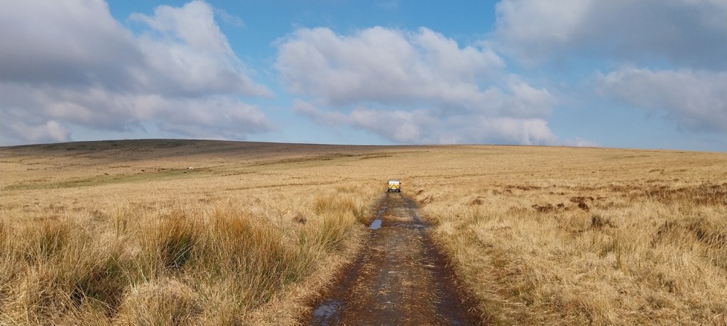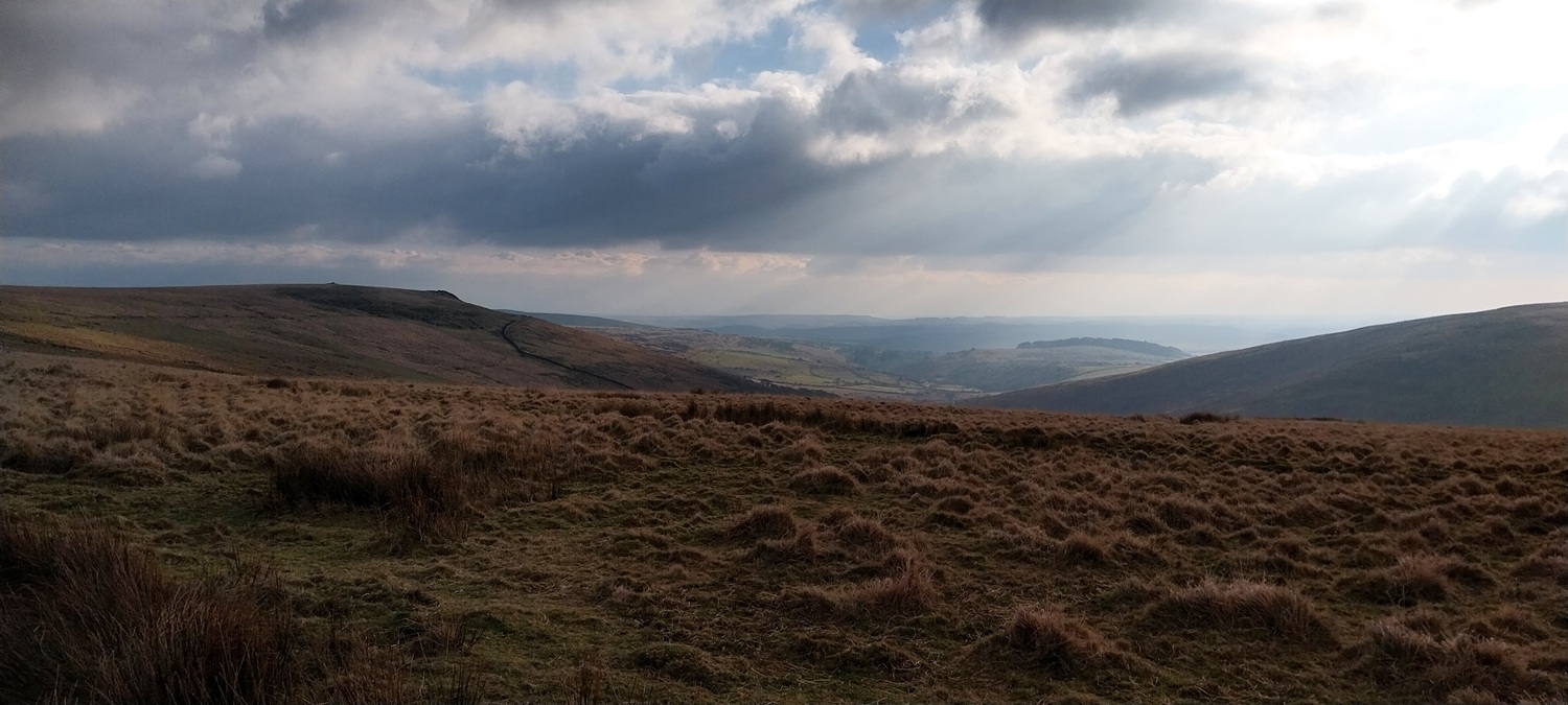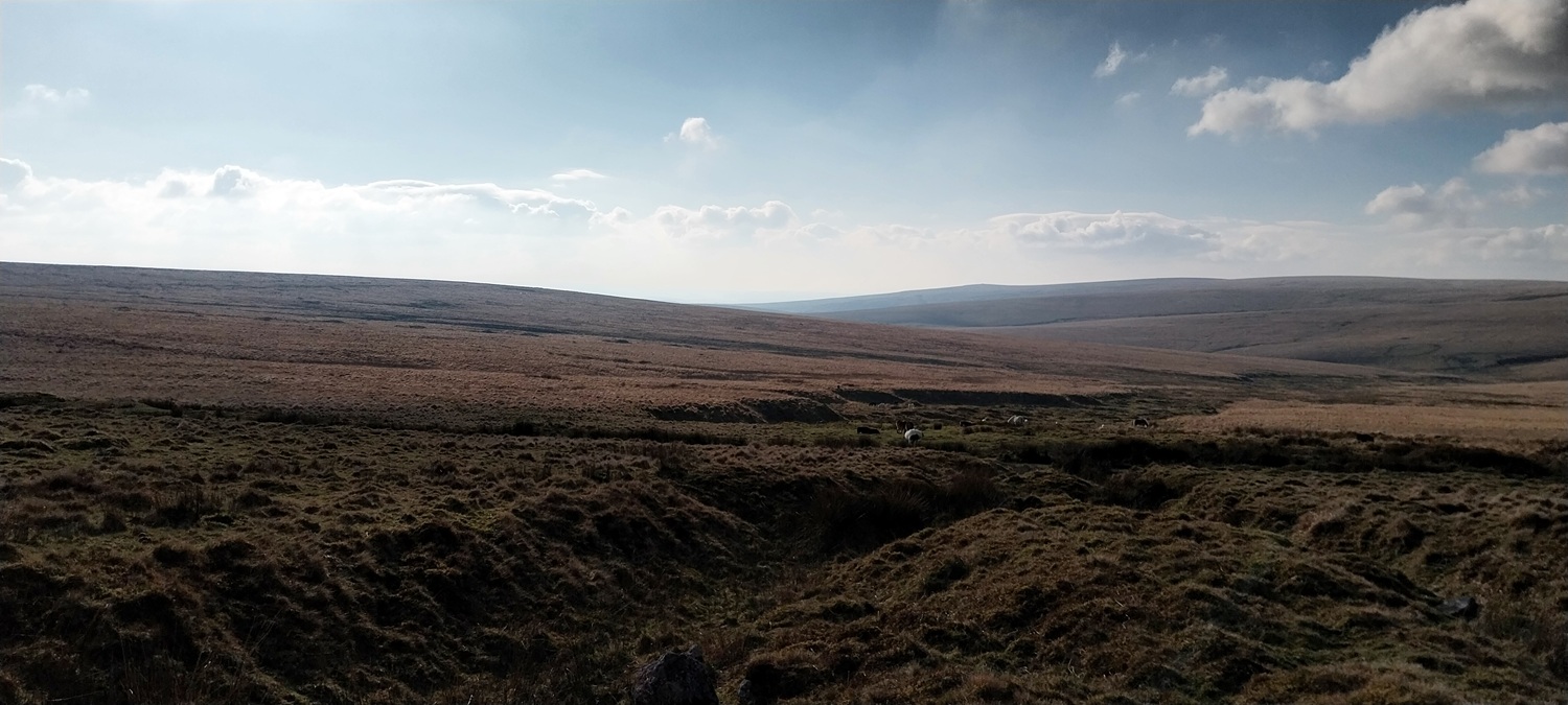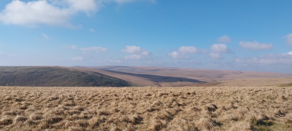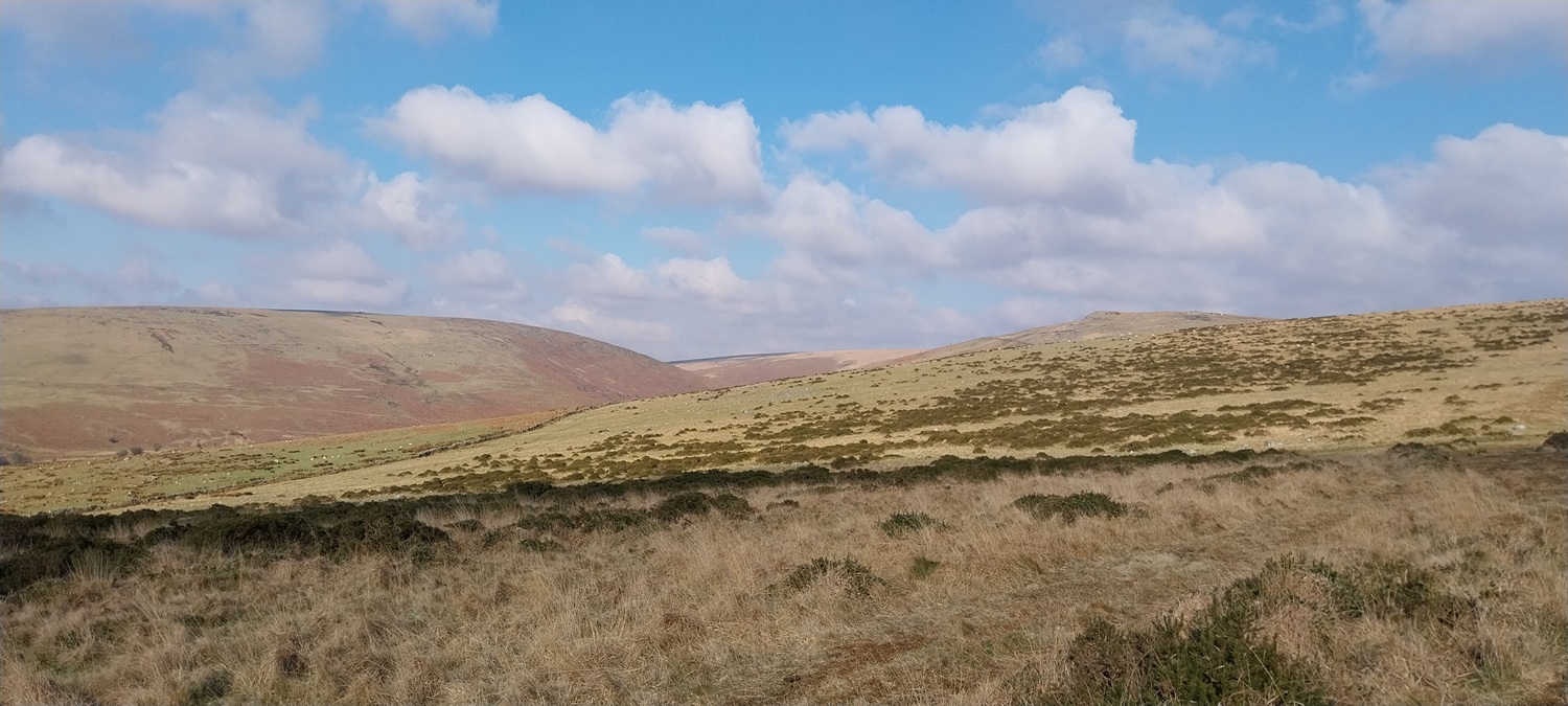 A fine weather day and a chance to get out, walking plans were made and forecasts checked. The forecast had blue skies in the morning, with cloud building from the east as the day went on, so we were planning on a trip to the west around Lynch Tor and Stannon Hill. A really poor nights sleep before however, with some very low blood sugars had us both waking up late, and only ready to leave the house around 11.45am. A new plan was rapidly hatched with an out and back to Quickbeam Hill from Harford, the area famously owned by those that want camping, picnics, sitting and other loitering activities to be banned from the moor. They have closed car parks to make things more difficult but all that has happened is people park in the hamlet of Harford, a few hundred metres down the hill, annoying the locals. Parking up in Harford, we had sunshine as we pulled up and the walk was mostly in the sunshine, and the cloud wasn’t too bad on this side of the moor, but we’d missed the clearer skies in the morning. That said this is a simple walk and once you reach Harford Moor Gate, you turn half left and up the long pull to Piles Hill, before a hop, skip and jump to the old Puffing Billy railway track, which would take you out to Red Lake. This is a long path (also part of the Two Moors Way), winding its way through yellow grasses, rolling hills, streams and very typical Dartmoor landscapes, only one tor to be found along this track. Our plan was just an out and back so we avoided the deviations to Sharp Tor or Three Barrows, preferring to stay on the track. Once out at Quickbeam Hill, we stopped for a late lunch, about turned, and headed back for the car. Its another hill ticked off for Linda and a couple of Dartmoor squares, but not a walk that needs to be repeated, and there are much better spots even in this area if you head off this track. A plan for the future with hopefully a better nights sleep prior to the walk.