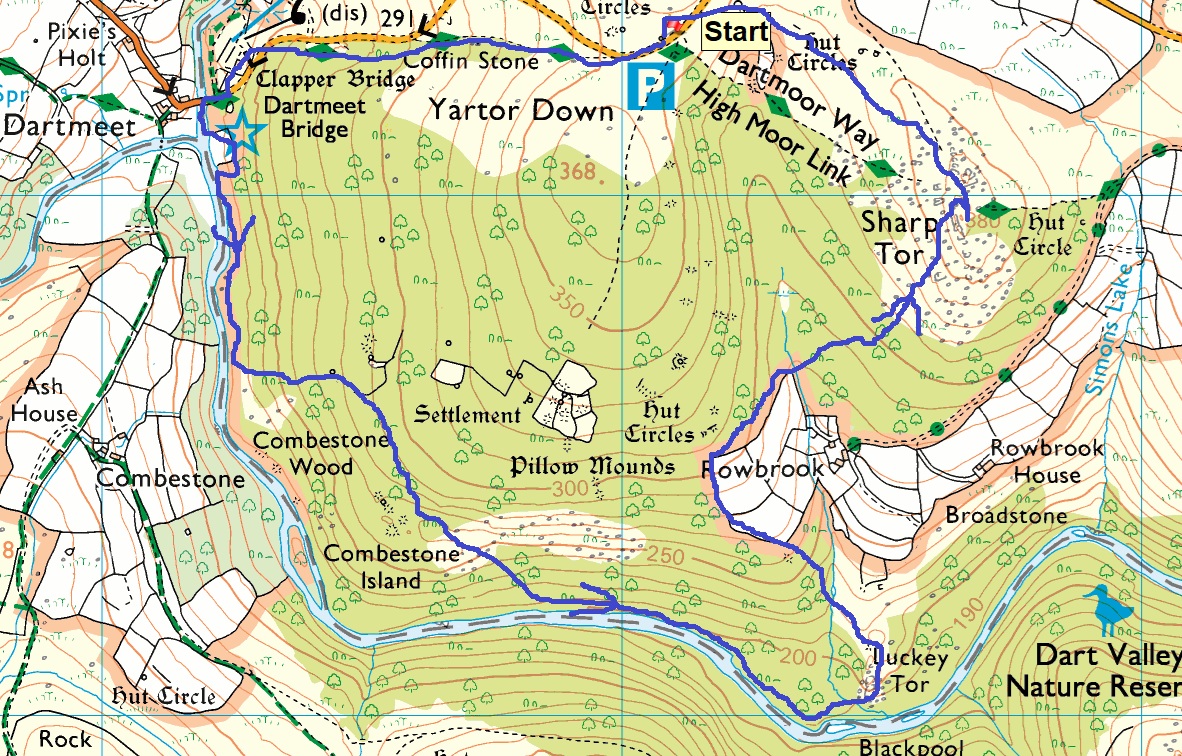 Route – Coffin Stone – Dartmeet Bridge – Dartmeet – Vag Hill Tor – River Dart – Luckey Tor – Rowbrook –Sharp Tor – Little Sharp Tor – Bel Tor parking