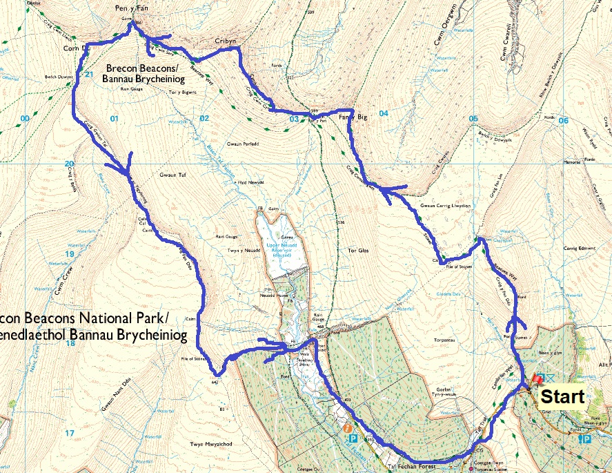Route – Waterfalls – Craig y Fan Ddu – Beacons Way – Fan y Big – Bwlch ur y Fan – Cribyn – Pen y Fan – Corn Du – Bwlch Duwynt – Craig Gwaun Taf – Graig Fan Ddu – Neuadd reservoir and buildings – Taff Trail – Talybont parking