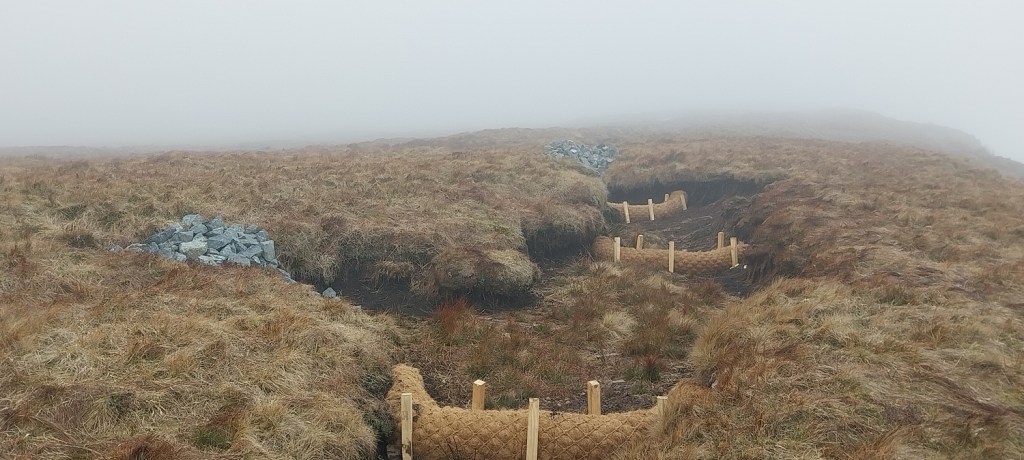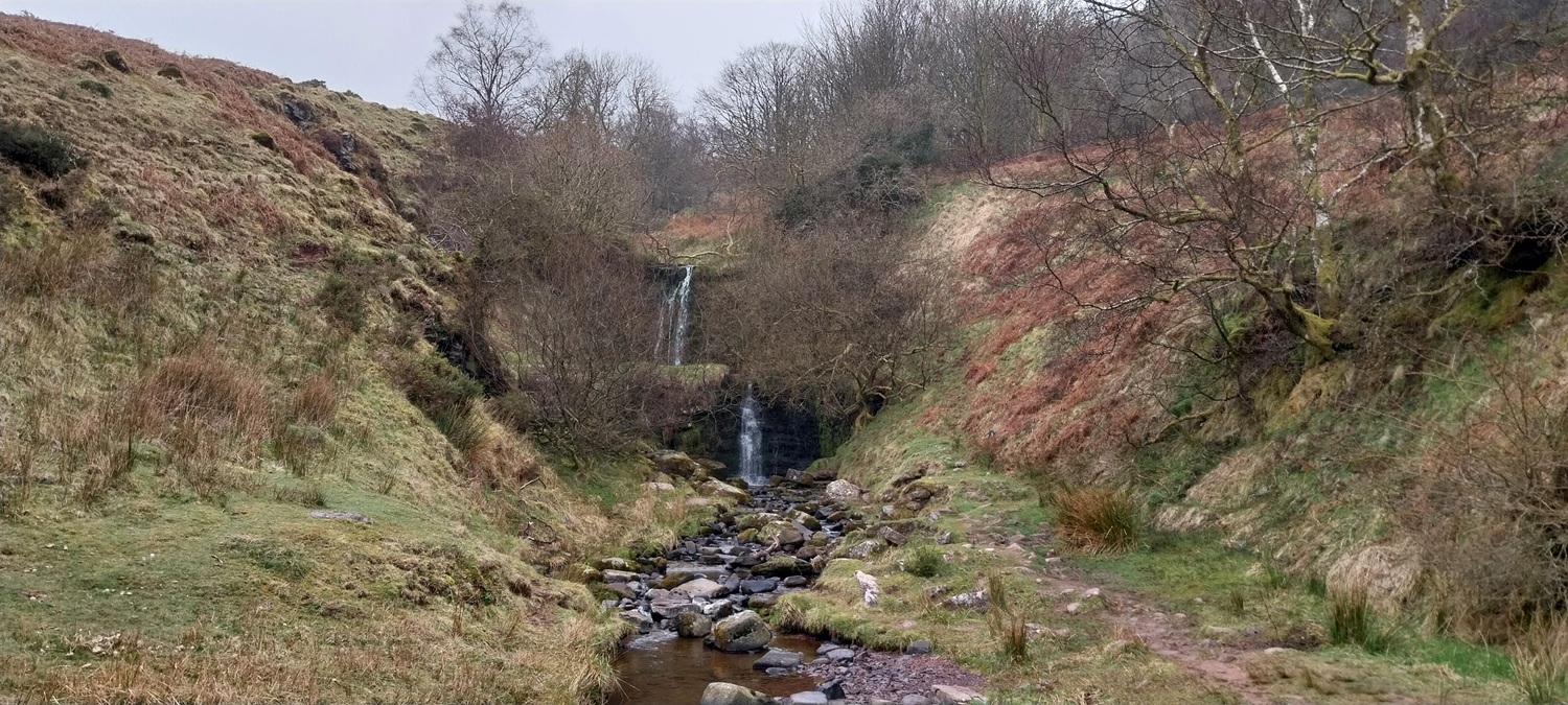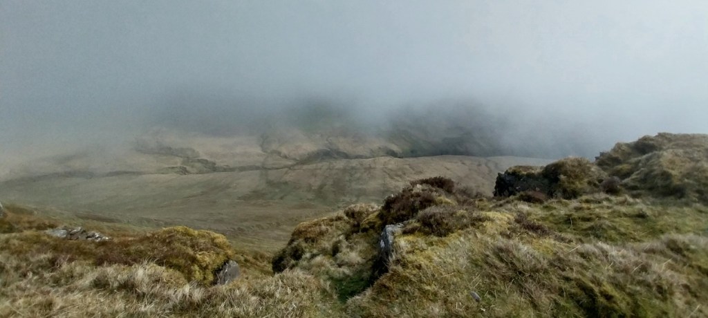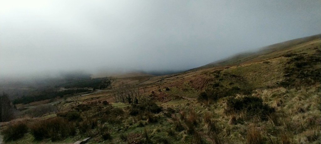 Starting point, to be fair in the Fechan Forest there are plenty of car parking spots and midweek these are normally ok for parking, this was a Thursday and 4 cars accompanied us at 9.30am for our arrival.Plenty of waterfalls are marked on the path up to Craig y Fan Ddu and this was the 3rd one in a short section of path. There’s also a waterfall walk from the same car park of around 2 miles and looking at the map you’ll see double figures in waterfalls I reckon.Cloud swirling around as we climb to Craig y Fan DduOn Craig y Fan Ddu and the cloud parts a little to look down into the valley Cerrig EdmwntAn example of some of the edges and paths, further on the walk the drops are much further as the height is gainedThe cloud start to lift as Linda looks across Cerrig EdmwntBlue sky, maybe, just maybe we may get some views for a bit, here we turn left and join the Beacons WayThis cairn marks the point you right turn back towards the edges and Fan y BigThese parts were almost like a pavement across here, heathery bogs all around, although with the lack of rain recently and good weather it was all pretty dry. At the end of this section we stopped for coffee.No views at all around the edge walk to Fan y Big, this is it but you can be certain there is a whole lot of nothing right of me here as it drops steeply 250 metres to the bottom of the valleyMe atop Fan y Big, or is that mounting Fan y Big!!As we dropped to Bwlch ar y Fan we could briefly see the forest around the Neuadd reservoirs, we are still on the Beacon Way here and about to steeply climb 200 metres to Cribyn.Linda on Cribyn summit, no views still.We quickly dropped off Cribyn and started off up to Pen y Fan, an ascent of around 225 metres. We made it about half way before stopping for lunch and finding this discarded disposable BBQ box, it was taken back to the hotel to be recycled that evening. Shame the owner didn’t bother reading the instructions on the backLinda on Pen y Fan. Considering we’d been in t shirts the day before it felt like we’d time travelled back 3 months to mid December!The two people sat over there were the only people we saw on the summit, almost unheard of up here on what is normally a heaving summit area.More edges as we head up the short climb to Corn Du, our last summit of the day.Corn Du summit, also pretty emptyWhat follows Corn Du is a superb walk along the Craig Gwaun Taf and Graig Fan Ddu edges, which look down on Gwaun Taf one way and Cwm Crew the other way. It is stunning in clear weather. We also saw a few wild horses up here as well.Looks like they are trying to restore some of the peat areas as well along hereThe two edges are around 2 1/2 miles long so its a fair distance and time later that you finally drop down to the Neuadd reservoir area. This path has also been flagged, including the steep climb up to the path along the edges, which is superb as this can be a boggy trudge across here.The old Neuadd reservoirs have been broken now and no longer store water. Plenty of old water buildings sit here thoughWhat’s left of the lower reservoirThe Valve houseAnd the old Control House, there is also an impressive dam wall and tower for the Upper reservoir, head to the left of the control house and out along a path/road to reach itLooking back along the Control House road. Pen Y Fan would normally be in view at the backWe joined the Taf Trail which would take us back to our carPentwyn reservoir now in view, just, as the cloud lowers and darkens furtherGate to nowhereCar park ahead, the path we took at the start follows those trees up to the leftAnd back at the waterfalls at the start of the walk. By this point we were tired and ready for some food. So fish and chips were bought to lift the mood somewhat!