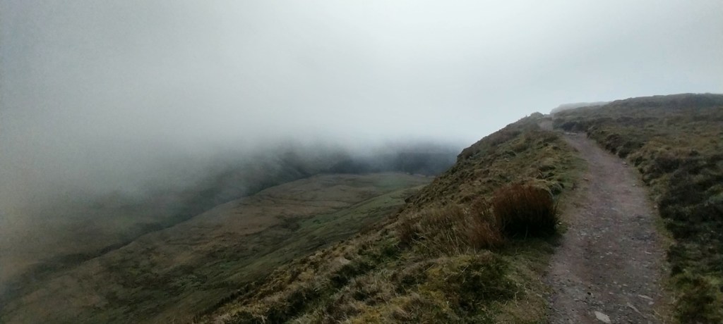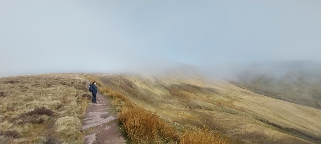 So big walk time for our little holiday in South Wales, and one of the classics in these parts, the Pen y Fan Horseshoe. The weather was a bit unconvincing in its accuracy, with it changing 2 or 3 times in 24 hours, but we went for it anyway, with hope for some cloud free summits at least some of the time. As it was, it threatened to clear completely, before dropping all together and not moving at all. So we walked for pretty much 10 miles with about 40 metres of visibility at most. Having done the highest in England, in cloud and the highest in Wales, in cloud, this now means we have ticked off the highest in South Wales, in cloud. Some sort of unfortunate hat-trick I’d say!! The edges around these parts of the country have to be seen to be believed, vertiginous is one word to describe the plunging drops on one side of the path. Unfortunately for us they were mainly masked by swirling clouds, meaning we never saw the bottom. Still we hit the tops of 4 of the bigger tops in the Brecons, so at least that is some sort of achievement and my first time on the humourously named Fan y Big! We are planning on Lord Hereford’s Knob next time to complete the set! Yep that’s a mountain in the Brecons as well.