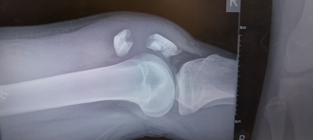 So this is the x-ray from the hospital that evening, those two pieces at the top are his patella and should be one. In fact there were around 6 pieces in total and he’d made a bit of a mess of his knee for sure. It happened rugby tackling his friend, not in PE, no. Instead at lunch, playing around. His knee was very painful and like a balloon. The ambulance said 3 hours to get there, so I turned up, drove across the school grass, loaded him in the front seat in agony and off to A&E. Roadworks at the front of the hospital, meant the drop off spots weren’t available. So we parked as normal in the car park, how we got him down the stairs and across the road I’ll never know, then an angel of a woman ran off and came back with a wheelchair for us and we wheeled him in. I remember well when they brought up his x-ray and nurses came from across the room to look at it, saying he’s done a “proper job of that”! Yes, yes he has.