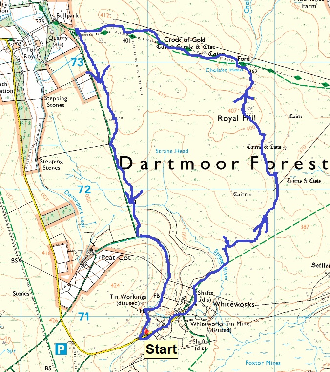 I’ll start this post with a bit of a warning, those with a squeamish disposition scroll down to picture four below the map, after reading this, and miss out the knee x-ray pictures! So to explain what happened, we’d been to South Wales and had three lovely walks, visited Linda’s daughter and seen lots of Abergavenny. We returned to work, celebrated my eldest’s 18th birthday and then on April Fool’s Day, I got a call from school, to say my youngest has hurt his knee, possible dislocation. I’ll say no more at this point and explain below in the photos, but let’s say it wasn’t dislocated! The recovery will be long, possibly 18 months and he will miss this year’s Ten Tors event in May and possibly next year as well, which is the last time he can do it I think. Then there is his GCSE’s this year as well. With all that going on we didn’t walk for a couple of weeks after getting back, so this walk took place in mid April, right at the end of the 6 week fine spell of weather we’d had. Rain was forecast that evening, so we headed out for a shorter walk, but picking off a notoriously soggy part of the moor. Royal Hill is a vast sprawling hill of modest height, but giving great views into the heart of the north moor to Cut Hill and Higher White Tor, it also has a nice rocky outcrop in its centre. The tiny outcrop of Strane Tor also sits on the southern side of Royal Hill, near to Whiteworks, which was our starting point. The return took us alongside a wall, heading for Peat Cot and the Devonport Leat, taking us back to the car. Still plenty for Linda to walk in this area, so we will be back, hopefully with the dry ground still beneath us, as the whole area can be pretty grotty when its wet.
