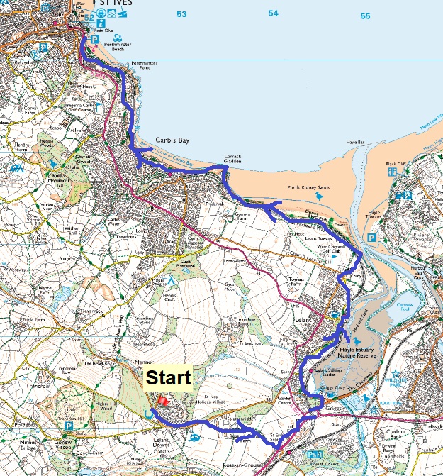 Route – Splattenridden – St Erth Station – Griggs Key South West Coastal Path – Lelant – St Uny’s Church – Porth Kidney Sands – Carbis Bay – Porthminster Point – St Ives – Train back to St Erth