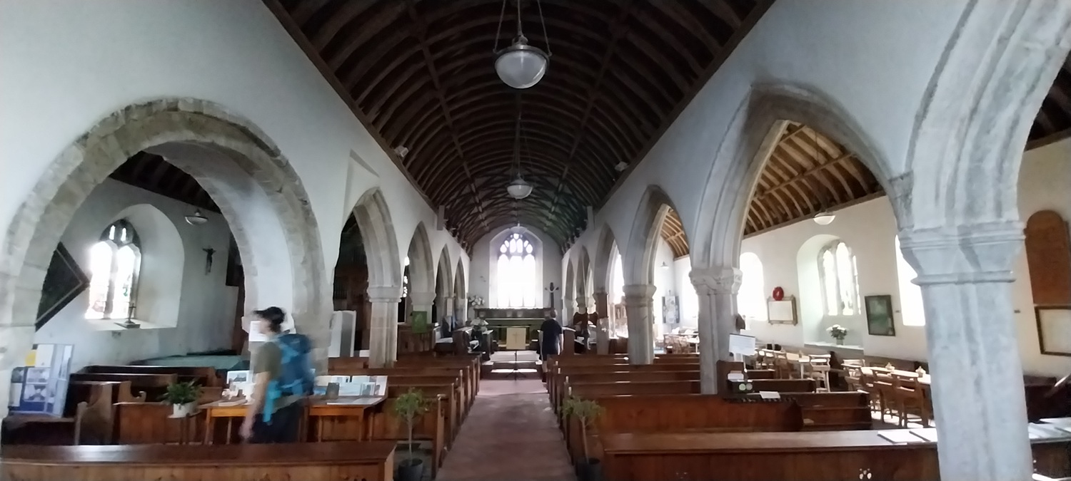 Believed to be Norman, from around the 12th century, extended in 1424 but buried by sand by 1530s. Restored again in the 1720s. There is a letter from King Charles on the wall thanking them for their help during the English Civil War