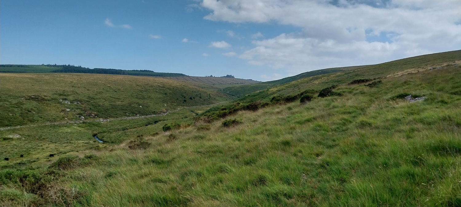 So the end of our coastal walks had arrived, we’d completed 9 walks in a row by the sea and Dartmoor’s Shipley Bridge with the Zeal Tramway seemed a long time ago at the start of June (here). So it was back to Dartmoor and choices of where to go endless, because it felt like a while since we’d been this way. I felt that Fernworthy Reservoir would be a good option, Quintins Man along the Whitehorse Hill is a good ridge and Manga Rails a fun crossing of the infant North Teign river. What I’d forgotten is Dartmoor in summer is horrid, not because of the bogs, no they are reasonably dry for Dartmoor, but the grass, the horrible, very long, tussocky grass. Great Varracombe, was hell on toast in a microwave and at the time I described Manga Hill with words that should not be typed. Both myself and Linda fell over at least twice, losing ankles down holes that we couldn’t see, all wrapped in warm humid sticky air. Not our favourite outing, and I really should have remembered the grass is horrible when it gets long, plus there is a better way to Quintins Man via Sittaford Tor, which avoids Great Varracombe. That said Manga Hill surprised me as I don’t remember it ever being this bad, I’ve read another walkers experience across here in the last week, which echoed my thoughts, so maybe it has worsened this year with the dry weather. Still the weather was good, the walk from Quintins Man to Whitehorse Hill was good and its better than being in work!