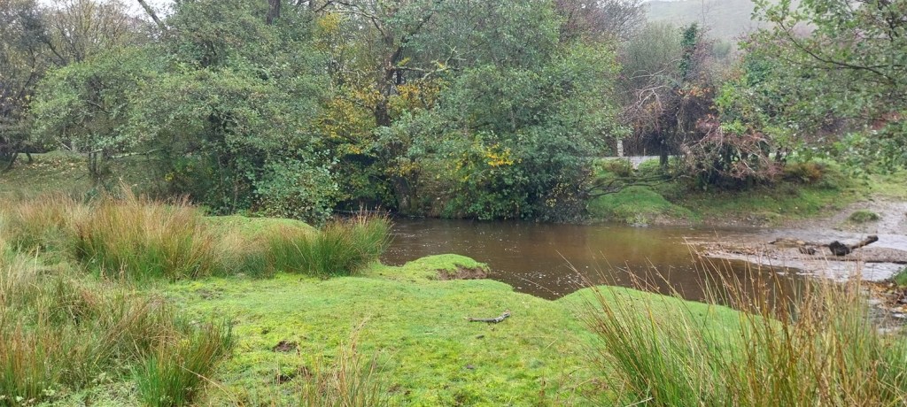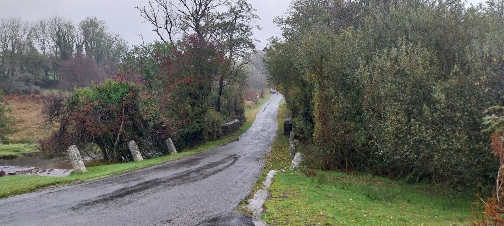Heading through October the weather was very mixed, continual weather fronts bring rain, some bright spells but the mild weather meant rain was never far away. This Sunday was due to rain in the morning and then clear from the west around 1pm. We figured a drive up to the moor, a short ish walk planned and to start walking as the weather was due to clear up. We parked up in rain, ummed and ahhed a bit and decided to eat lunch in the car first, surely the rain was due to stop soon. The weather app had push the rain clearing to 2pm, so we set off, heading for Pixies Cross. The one advantage of the rain was no golfers on the Tavistock course, so we walked the fairways in a direct approach the cross. Arriving quickly I again looked at the weather app, now saying 2.30pm for it to clear. We headed off downhill to Furzey Lane Bridge and then looped over to Pennycomequick Bridge, which meant with the cross and the first bridge we had 2 Dartmoor squares picked up. We set off for Sampford Spiney, with a plan to climb Pew Tor on the way, the rain was still falling and cloud was low so we headed of to the village first. We dried off a bit inside the church, but before long we headed back out into the rain, the app now saying 3.30pm for it to clear. We climbed a little back to the road which would take us to our car, and as we walked underneath Pew Tor for a second time, the cloud started to clear and blue sky could be seen to the west. Too late now to head up to the tor, we trudged back to the car, arriving as the sun hit it, a very damp walk all in all and not one to make any year end best walk lists.