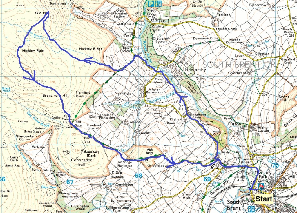 Route – Lydia Bridge – Aish – Binnamore – Hickley Plain – Henchertraw – Old Hill TorWacka Tor – Corringdon Ball Gate – Aish Ridge – Aish – Lydia Bridge – South Brent Church – South Brent