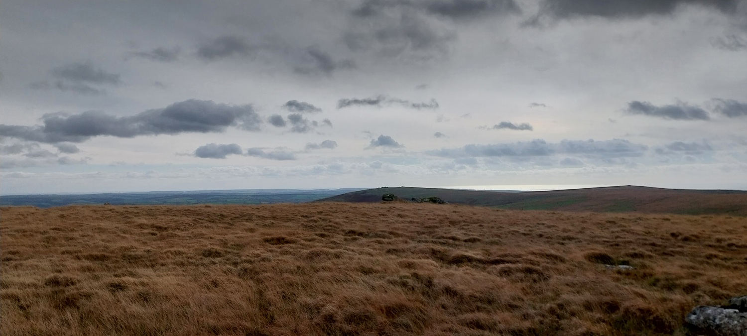 Outcrops ahead backed by Ugborough Beacon and Butterdon Hill to the right. The sun is glinting off the sea in the far distance