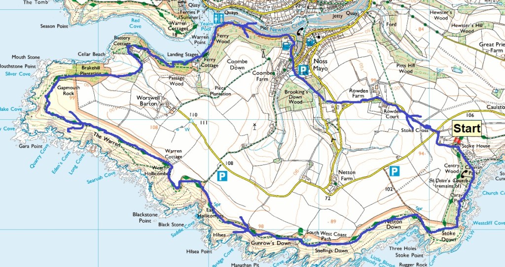 Route – Stoke Cross – Noss Mayo – South West Coastal Path – Ferry Wood – Mouthstone Point – Gara Point – The Warren – Hollicombes – Coastguards – Stoke Point – St Peter’s the Poor Fisherman – Stoke House