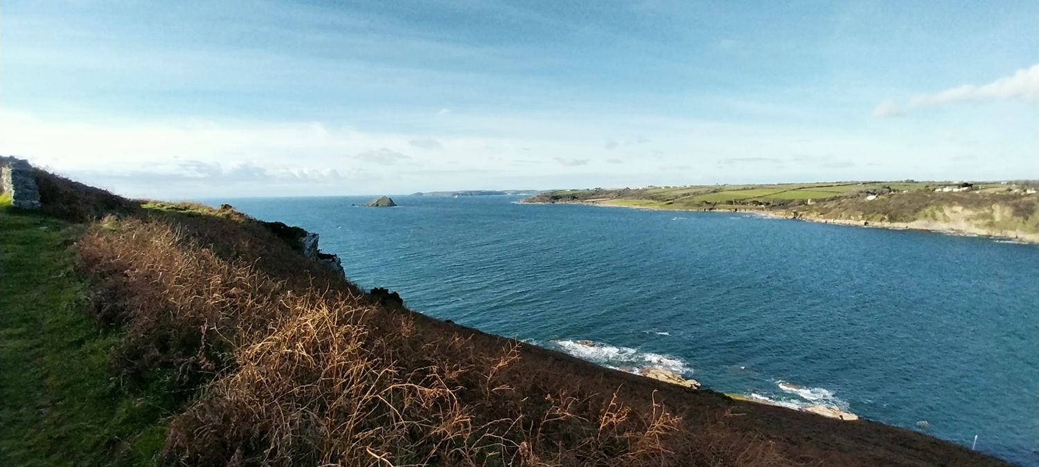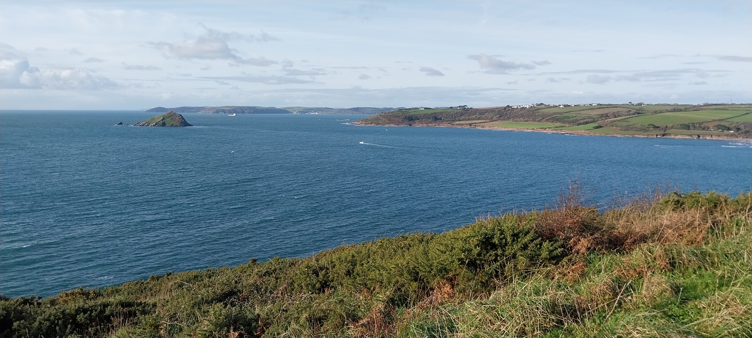 This is the view from Battery Cottage, once the site of a 14th century fortification. You can see from the views the fine line of sight you would have from up here when defending the River Yealm entry. The island is the Mewstone off Wembury Point