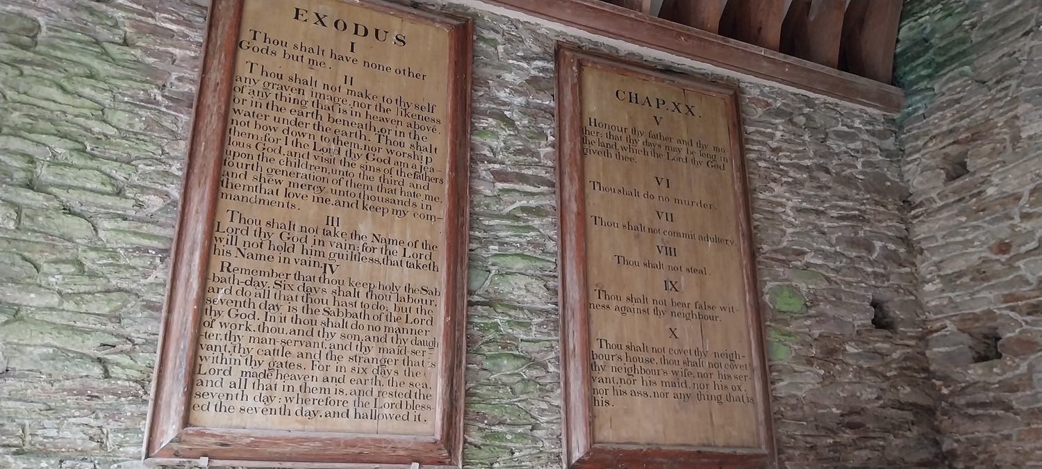 The ten commandments inside, the church is grade 1 listed and the roof has collapsed many years ago. It was last used in the 1970s as a church and is now run by the church conservation charity