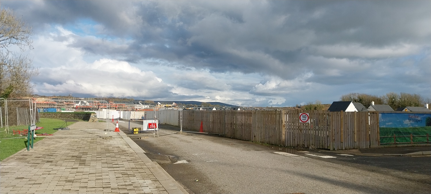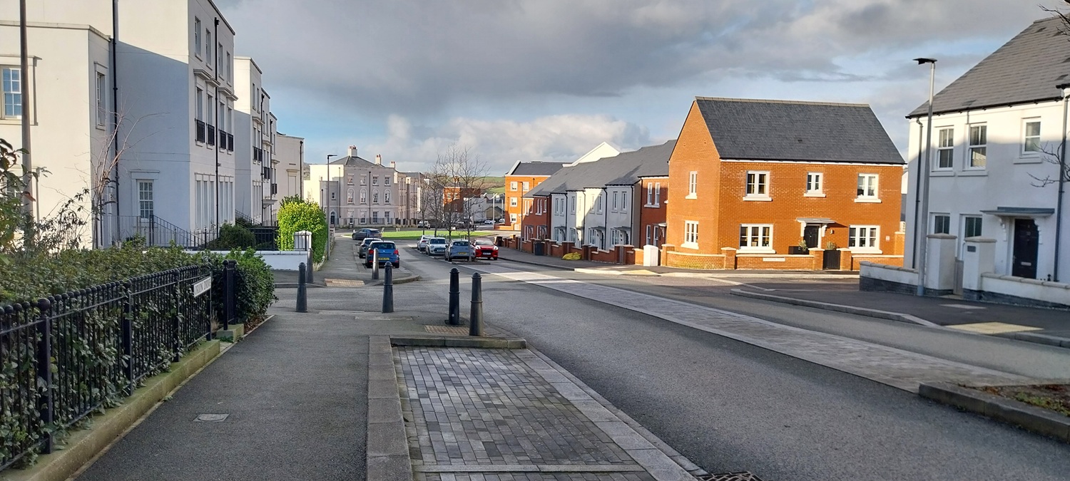Our on the main road now, we are on the left here as I look back to the main part of Sherford. We are heading behind the camera.