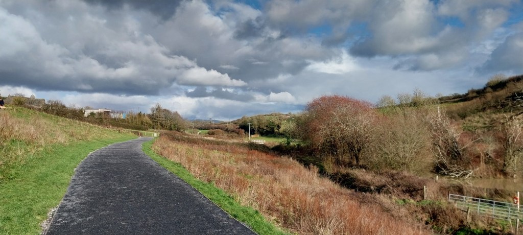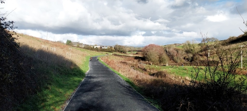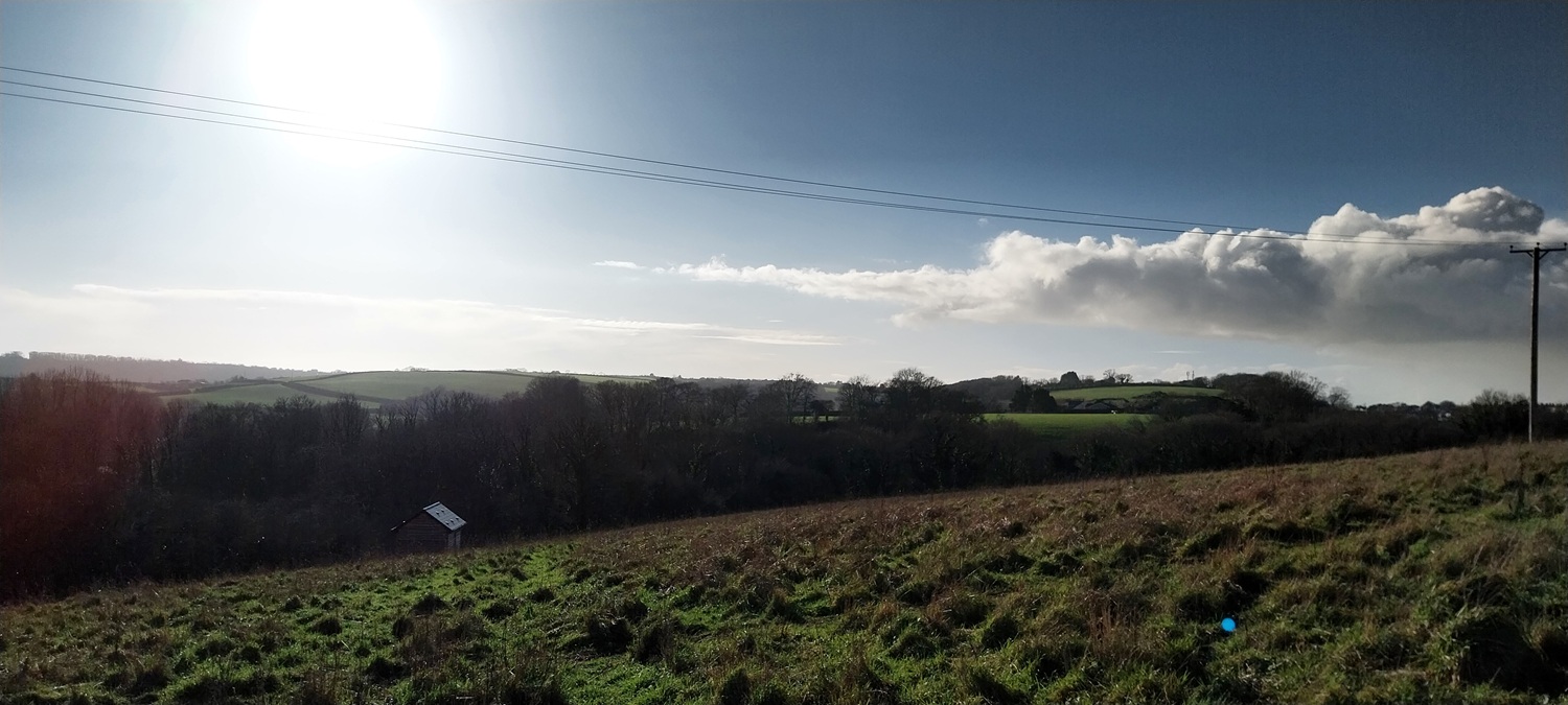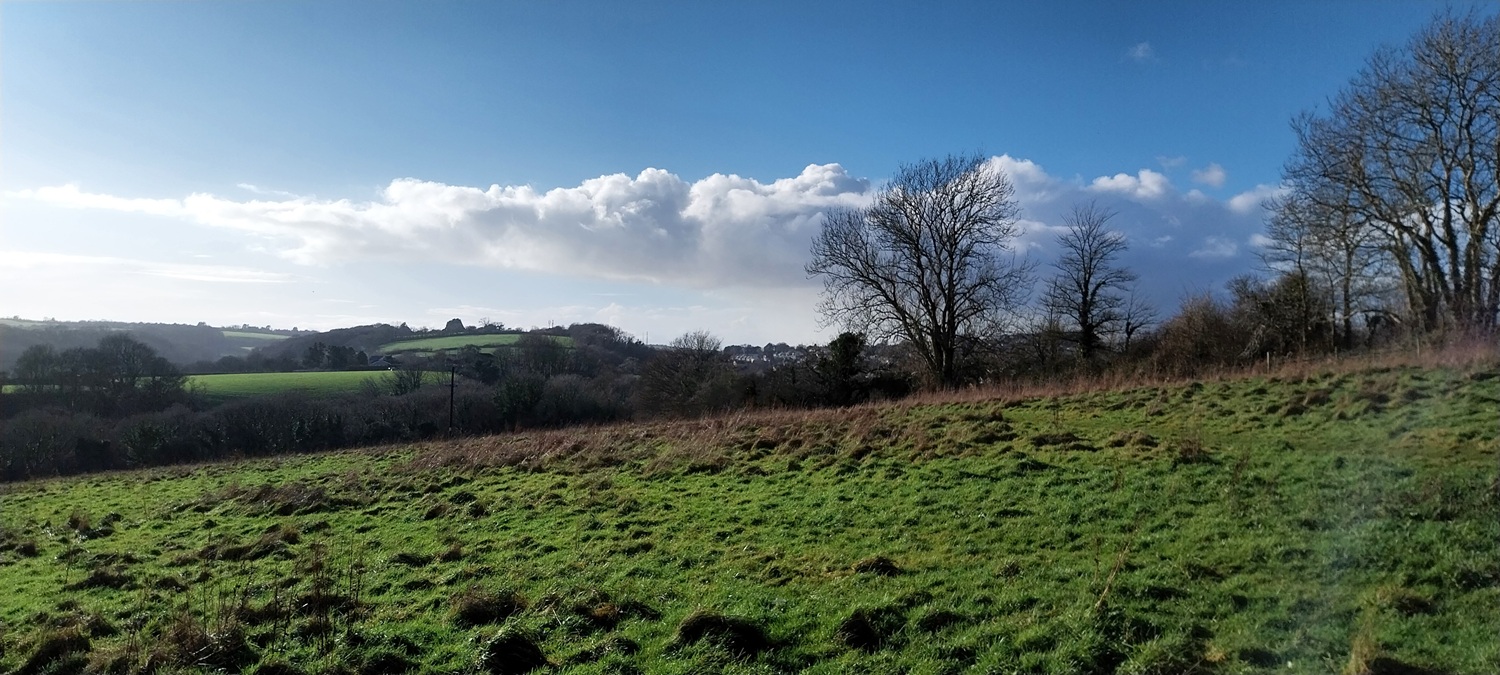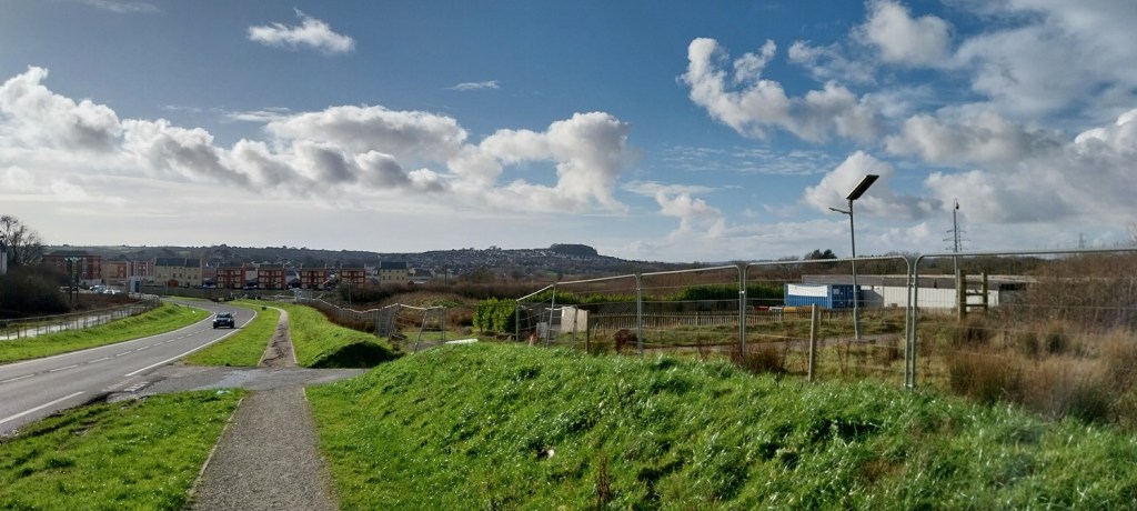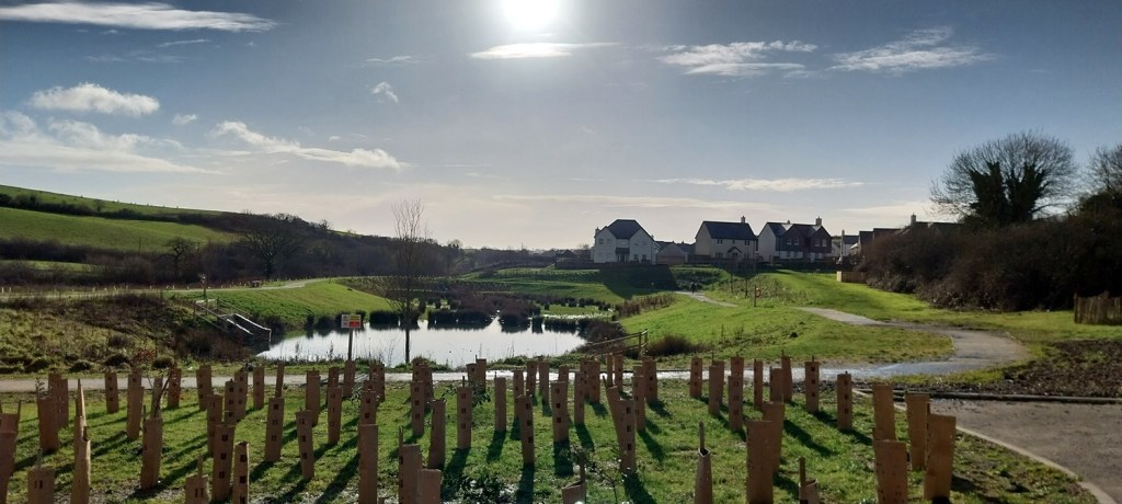 So January started superbly, some lovely cold crisp days and even a bit of snow, but from then on we’ve hardly had any days free from rain, with three named storms and lots of flooding. As a result Dartmoor is pretty much full of water, even more than normal. So on a break from the rain, before the next batch arrived we headed out from the front door to have an explore at the expanding green space being created near our front door. Now I need to say that this was always a green space, or at least farmland before, so its not quite grassland reclaimed back from industry, but you get the gist. Its a simple walk, out from the door, along the main road a bit and into the next estate which is newly built. Over the next year our part will join to this new area, making a walk to the park area easier for us. We walked around the pond and followed the path along the bottom of the valley, before climbing at the far end to the estate on the other side of us, we walked back through that estate, to the main road and back to our part. A few miles maybe, but it was at least a chance to get out in the sun, inbetween the monsoons we’ve been getting!