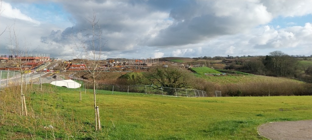 Dartmoor in the distance, with Western Beacon on the right and Butterdon Hill left of that. That is the southern tip of Dartmoor and we can see that from our house (through the trees). Again I’m stood on the road which will link to our small estate, and then on to the new estate we walked through earlier (photo 3). As you can see clouds are building over and within an hour or so it was raining again. Hopefully February will be better!
