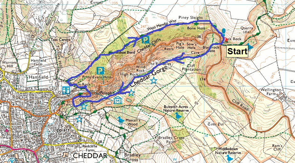 Route – Cliff Plantation – The Pinnacles – Jacob’s Ladder – Cheddar – Lion Rock – West Mendip Way – Piney Sleight – Black Rock