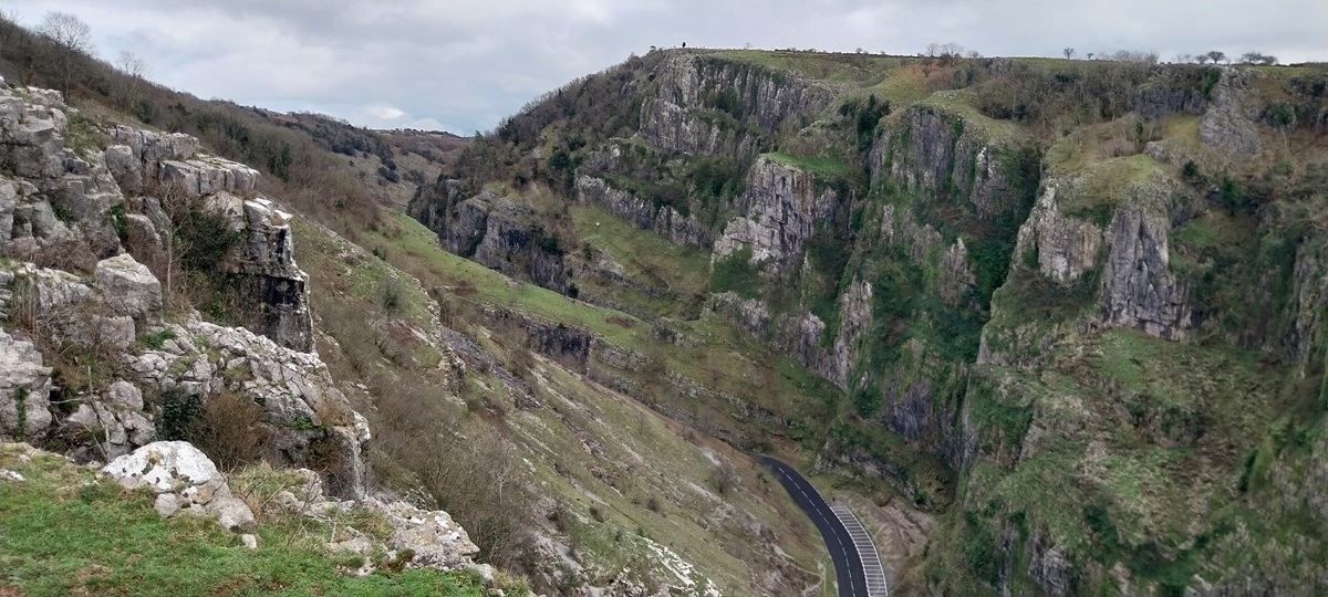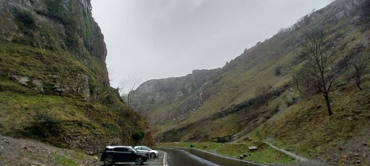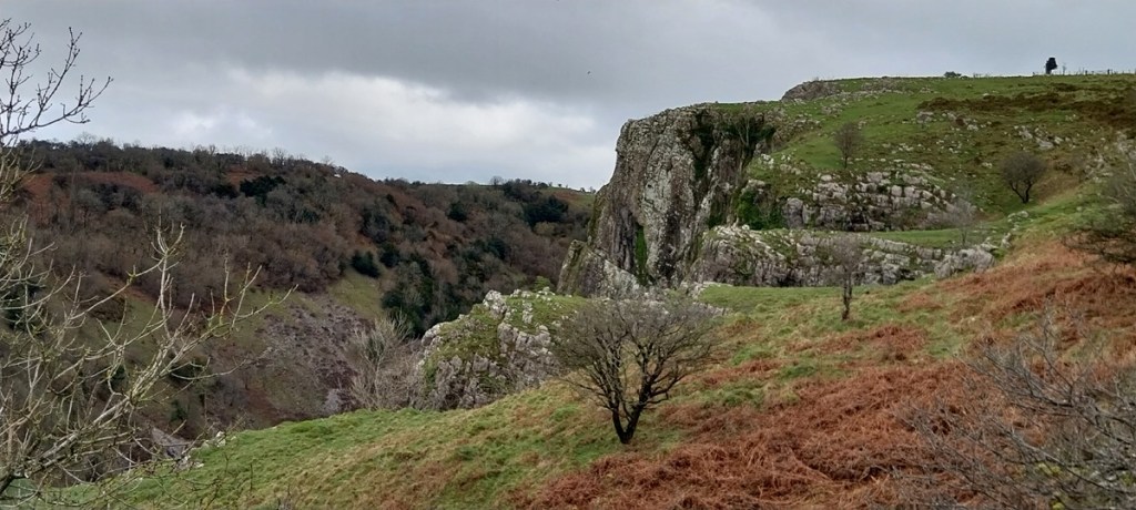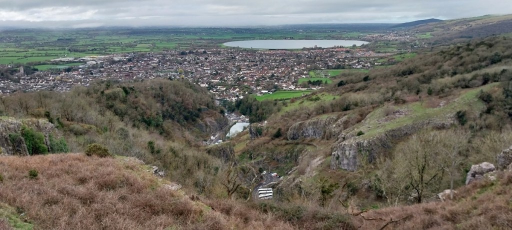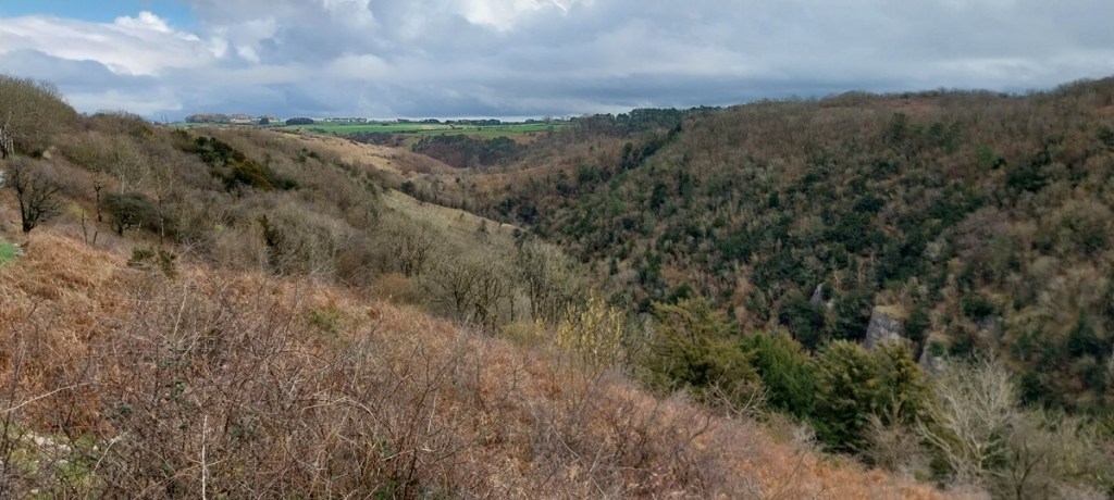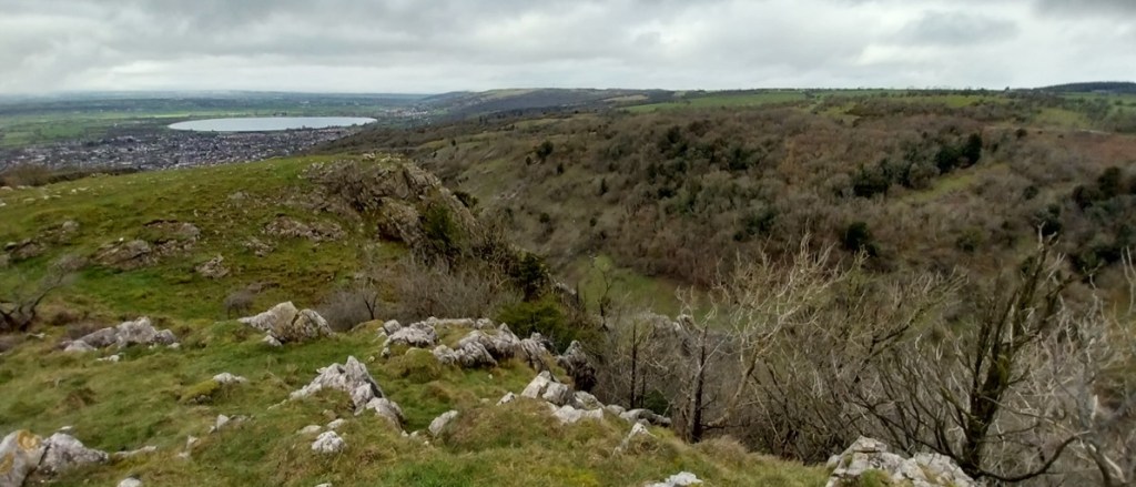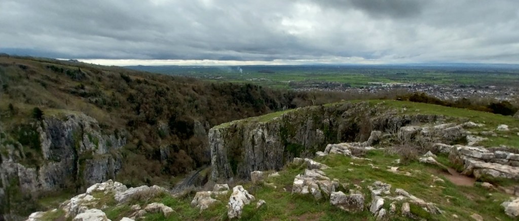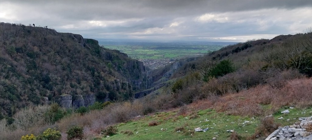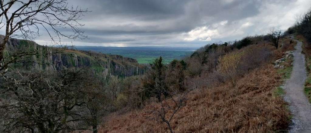 Day 2 of our little break and we headed out to Cheddar Gorge, a place Linda wanted to visit for her birthday. We were still waxing lyrical about our visit to Wells the previous day as we drove to the village of Cheddar, but that all stopped as we entered the south western corner of the Gorge, cliffs towered over the car as the road snaked its way in a north easterly direction and I did my best to keep looking at the road. All too quickly we reached the car park at the other end, this one is free, unlike the ones inside the gorge and at Cheddar, so we parked and booted up. With the car park being in the dip between the two cliffs, the start of the walk is uphill straight away and it was a short steep pull up into the Cliff Plantation for us. We got good views almost straight away as we climbed, passing through copse of silver birch as we went. We then broke out from the trees onto the cliff tops above the gorge, with some lovely views in every direction, particularly west across the flat plains of the Somerset Levels. We then started to slowly drop down, eventually finding the top of Jacob’s Ladder, we’d read that access to this was a charge, but either it is free in winter or free if you are descending (which if so I’d recommend the clockwise route we did). We quickly dropped down the 274 steps with a school party following us, who’d been up the tower at the top of the Ladder, we popped out on the road below, amongst all of the trinket shops and tourists paying for entrance to the caves. We quickly found Lion’s Rock and the West Mendip Way path which starts up and onto the northern cliffs of the Gorge, as we climbed my blood sugars took a dive and we stopped on a fine cliff outcrop for lunch, with views down to the road near Horseshoe Bend. At this point we’d passed through another piece of woodland with the path opening out to give great views up and down the Gorge and across to the cliffs on the other side. We really enjoyed the path on this side, as it gave better views of more of the Gorge and we could appreciate the cliffs and crags on the opposite side. As the path dropped steeply down we got one last great view back along this little gem, with the village of Cheddar at the far end. We arrived at the car and sat having a coffee as the rain teemed down, talk about perfect timing. We drove back through the Gorge, stopping off briefly in a car park to quickly take a photo of the steeple like cliffs, before heading back to the hotel. All in all its a lovely walk, not very long at all at 4 miles, but it packs a punch in the climbs out of the Gorge at either end, really pleased to have done this one and there are lots of paths heading off away from the Gorge to enjoy as well if we revisit.